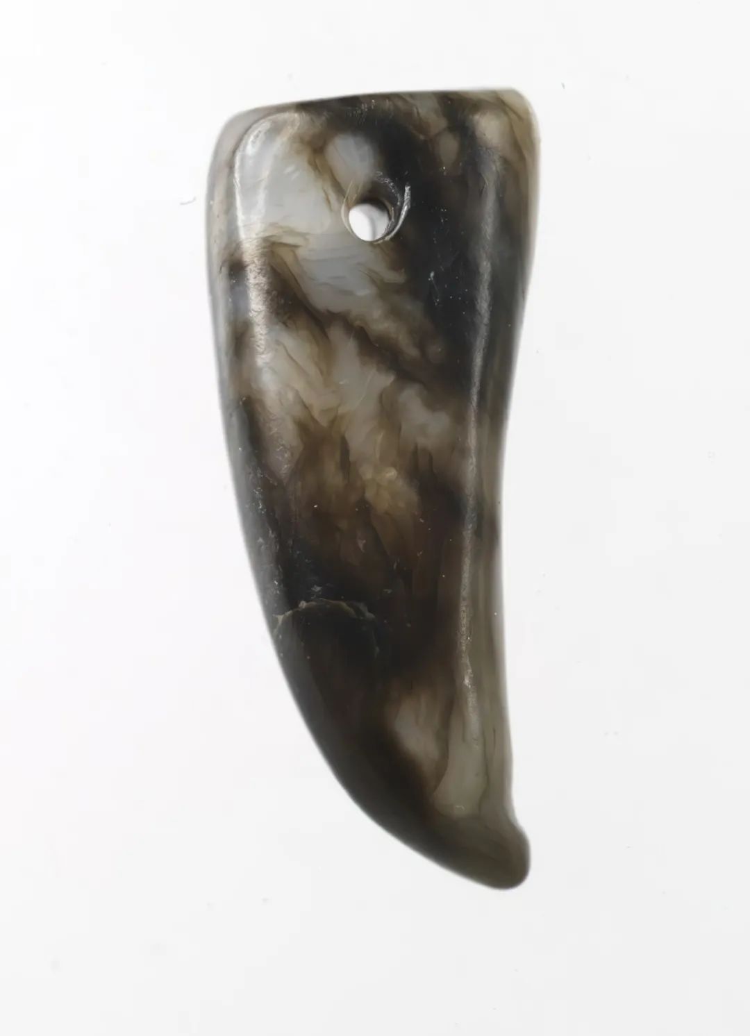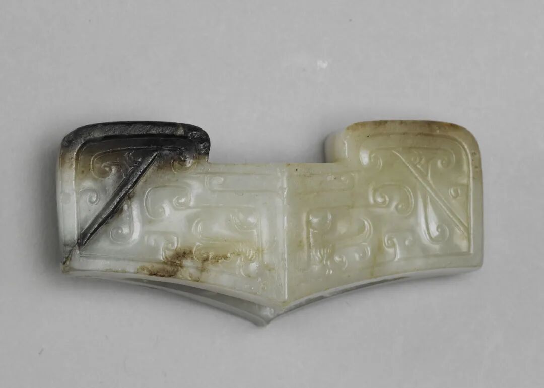 不同形态的水银沁成因与埋藏环境有关,也与入土的年份有关,更与玉器自身的材质有关。一般来说,呈块状、斑状的年代较为久远,从新石器时代晚期的红山文化至宋代,都有玉器上出现水银沁,呈色较深,切入玉理,表面十分光亮。“膏药脂”“芝麻点”生成于唐至清各朝代。