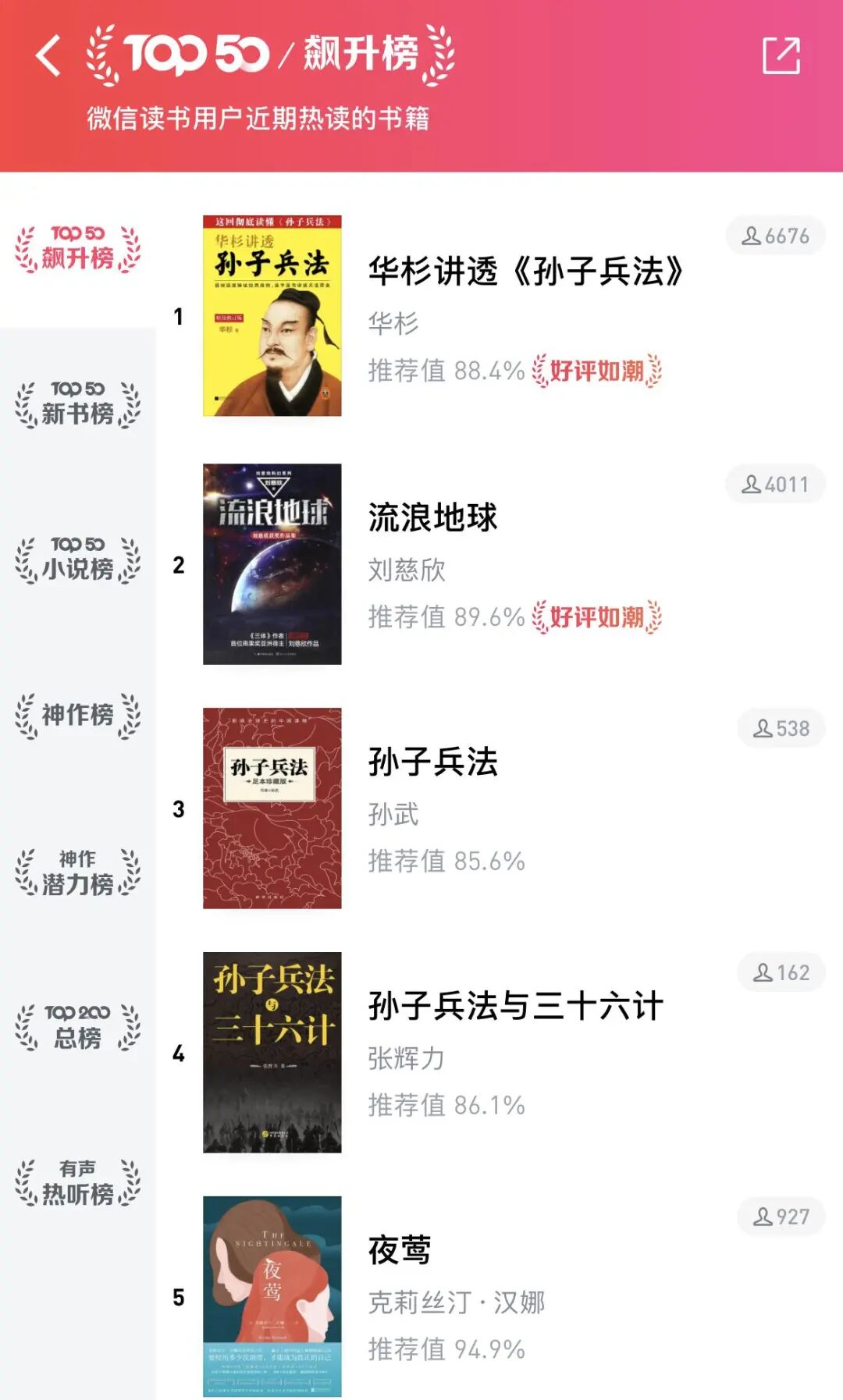 而在微信读书飙升榜中,《孙子兵法》同样拿下了第一名,排名比《流浪地球》更高。