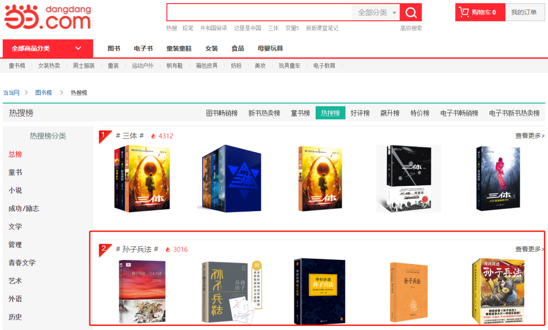 在当当网可见,各种版本、注本的《孙子兵法》在热搜榜中跻身排行榜前列。