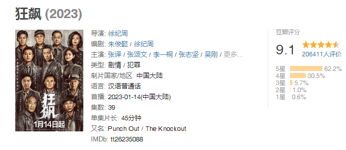 最近,电视剧《狂飙》正在热播,全剧以高启强的发家史为线索,讲述了近 20 年反腐扫黑的故事。目前其在豆瓣评分已高达9.1,二十万名观众给出评价,5星好评占62.2%,成为2023年开年最重磅的剧集。