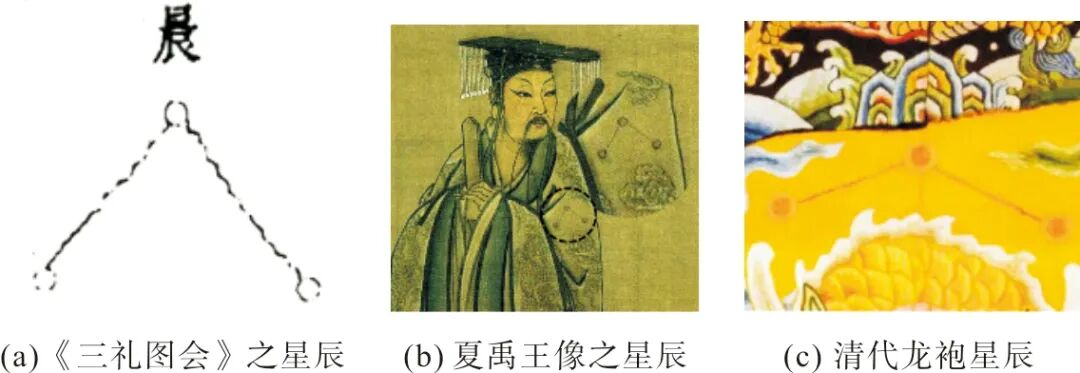 就星辰而言,星星颗数是主要问题。《三礼图》中,除太常旌旗外,“玉辂”旌旗上的星辰或以两颗星为一组,或以五颗星为一组,呈波浪状(图4)。江西德安南宋周氏墓[16]出土一罕见的彩绘星宿图,图上密布星辰纹样,星星颗数从两颗到数颗不等(图5)。在日本奈良国立博物馆所藏的南宋陆信忠《十王图》上也有大量杂乱无章的星辰纹(图6)。而目前,最早的星辰纹见于美国波士顿博物馆所藏的唐代阎立本《历代帝王图卷》中晋武帝司马炎像(图7),司马炎身着冕服,星辰以三颗组成状。阎立本擅长工艺绘画,在唐高宗时官拜右丞相,故其所绘具有可信度。另外,身居明朝御史、神宗傅师等高位的王圻,其所著《三才图会》《北京故宫南薰殿旧藏商汤王像》和清代龙袍中的星辰也都是三星状(图8),这反映出自隋唐以来,章纹的一脉相承。选择三星相连,而非其他颗数,或是因为“三”在古代的特殊意涵。早在春秋时期老子《道德经》载“道生一,一生二,二生三,三生万物”,之后许慎《说文解字》对“三”的解释,“三,天、地、人之道也”及许多带有“三”的成语,都表明“三”的特殊性。在古代,“三”是礼数,是“礼”的体现。戴圣《礼记》载“卜筮不过三”,王肃云“礼以三成也”,“三”逐渐成为古人的礼制规范。因此,冕服多以三星成纹是文化的象征。至于其他地方、其余颗数的星辰纹,应是起装饰作用。综上,宋代冕服的星辰纹以三星相连应是确史。