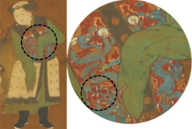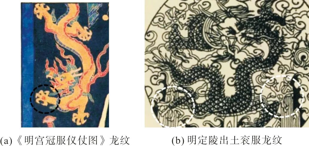 《三礼图》衮冕、上公衮冕的龙纹绘五爪,《礼书》大裘冕和衮冕龙纹为五爪,十二章服则是四爪。北宋皇陵多处龙纹石柱上也存在三爪、四爪、五爪不等的情况[17](图11)。在元丰五年进士郭思所画《戏羊图》(图12)中,一孩童衣着华丽,耳戴圆玉珠饰环,腰束红、蓝、白三色宝石镶嵌之金带饰,最重要的是胸前有蓝青色五爪双龙绣补,可知其身份尊贵。假如宋代五爪龙纹仅皇帝可用,作为进士的郭思不可能不知道这项规定,选择冒着风险在孩童衣服处画五爪龙纹。由此推测,宋代五爪龙纹并非天子专属纹样。但宋徽宗所绘《祥龙石图卷》(图13)中,有三龙遨游于云纹,三龙四肢五爪。效法宋代冕服的明代,其《明宫冠服仪仗图》和明定陵出土衮服龙纹也为五爪(图14),清代亦是如此。据宋濂《元史·舆服志》载,延祐元年冬,仁宗认为近年来“所在士民,靡丽相尚,尊卑混淆,僣礼费财”且“贵贱有章,益明国制”,于是,为了辨服色、明尊卑而命中书省定服色等第,其中“惟不许服龙凤文(龙谓五爪二角者)”。亦即,关于龙纹和龙爪的规定,已知最早的是元代仁宗时期。在元仁宗前,包括宋代在内,一般龙纹装饰物并无特别的爪数限制,只有冕服上的龙纹必须为五爪。