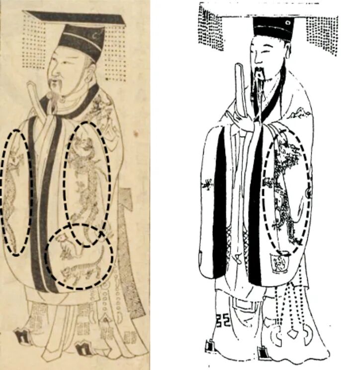 二书中,四升龙在天子冕服,一降龙在上公衮冕,或是天子为升龙,臣子用降龙的规定。冕服是礼服,为凸显不可随意逾越的礼仪尊卑,早在服饰定制的东汉就已作出规定。范晔《后汉书》载:“夫礼服之兴也,所以报功章德,尊仁尚贤。故礼尊尊贵贵,不得相逾,所以为礼也。非其人不得服其服,所以顺礼也……故圣人处乎天子之位,服玉藻邃延,日月升龙……贤仁佐圣,封国受民,黼黻文绣,降龙路车。”冕服具有等级性,不可逾越,不同等级的冕服象征着封建阶层的尊卑。因此,天子之冕服作升龙,臣子只能用降龙,这是“礼”的要求和约束。而就宋代来说,纵观《宋史·舆服志》,从宋太祖建隆元年、仁宗景祐二年、英宗治平二年到徽宗政和元年,再到南宋,凡是升龙的记载都在皇帝冕服上,降龙则在诸臣祭服中。因此,升龙与降龙的差异在于皇帝冕服用升龙,大臣用降龙。