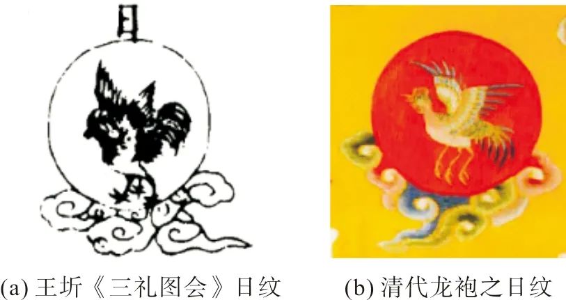 就日纹而言,金乌是二足还是三足,学术界早前已有讨论。在研究马王堆出土的帛画上二足金乌的问题时,邢萍[15]纵观史书古籍发现:“西汉末年和东汉时期多‘金乌有三足’的记载,但西汉初期之前史料中虽有金乌记载,但无金乌是三足记载。”也就是说,西汉初期对于金乌足数并未点明,后期金乌则为三足。由此,或认为聂崇义沿袭了西汉后期的观点。此外,受宋代章纹影响的明、清两代,日纹金乌皆为三足(图3)。而《宝相观音图》作为绘画作品,受画家主观意识影响,可信度小于《三礼图》。故认为宋代日纹金乌为三足。