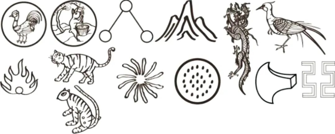 “十二章纹”滥觞于原始时期的图腾文化。戴圣《礼记·明堂位》载:“有虞氏服韍,夏后氏山,周龙章。”在当时,不同部落选取不同的纹样作为身份的象征。西周时期,十二种纹样汇集,形成纹样的组合,即“十二章纹”。《尚书·益稷篇》记载了章纹与服饰的结合:“予欲观古人之象,日、月、星辰,作会。宗彝、藻、火、粉米、黼、黻,絺绣,以五采彰施于五色,作服。”而到东汉,范晔《后汉书》载:“天子、三公、九卿……祀天地明堂,皆冠旒冕,衣裳玄上纁下。乘舆备文,日月星辰十二章,三公、诸侯用山龙九章,九卿以下用华虫七章,皆备五采。”“十二章纹”与服饰结合的章服制度被确定下来,为后世所沿用。从原始时期的图腾文化到封建时期的章服制度,诚如李砚祖教授所说:“纹样的民族性或文化性中仍深深保留着来自远古时代的历史回音。”[1]自史前至明清,“十二章纹”的传承像是中华文明的缩影,在时间的流转与朝代的更迭中,逐渐发生变化。从简陋朴素的史前原始社会,到讲求礼乐的西周奴隶社会,再到“独尊儒术”的汉代封建社会,生产力发展所带来文化上的飞跃,使得“十二章纹”因时损益,产生不同朝代的差异性。此外,历代关于“十二章纹”的记载多以文字为主,而“使用文字来描述事物的时候,意味着大量的信息被高度概括和抽象化”[2]。因此,本文的研究重点之一即其形象问题,实现其“从文字到图画”的转换。
