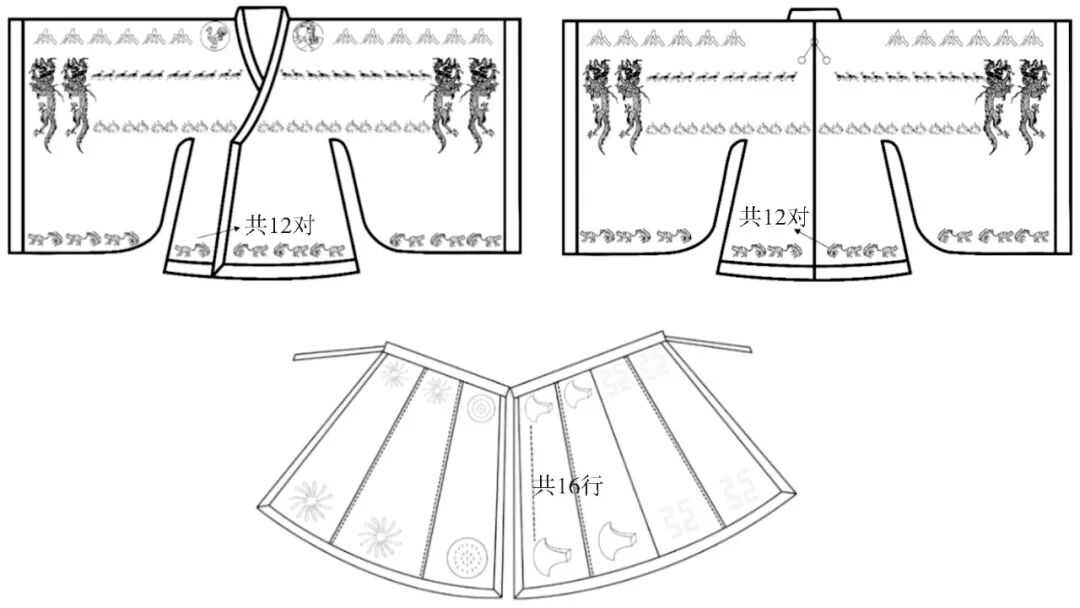 综上所述,再结合《三礼图》和《礼书》所绘(图19),推测宋代十二章纹排列分布如下:上衣,日一,于左肩;月一,于右肩;星辰一,于背面领后;山二十四,正背面各十二,于手臂方向袖端处;升龙八,正背面各四,于左右袖口方向袖端处各二;华虫、火、宗彝,正背面各十二对,共四十八,依序沿衣襟处。下裳,藻、粉米、黼、黻共十六行,每行分别为二、一、二、二,横向等距分布于下裳上(图20)。这就解答了“此章饰于上衣何处,彼章饰于下裳何处”的问题。