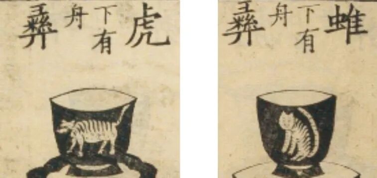 十二章纹之宗彝指的是虎、蜼二纹,在宋代应是没有异议,问题在于宗彝的样式。《三礼图》虎、蜼单独画于冕服上,而《礼书》的则是置于彝尊里。聂崇义在“衮冕”处写道:“宗彝,古宗庙彝尊名,以虎蜼画于宗彝,因号虎蜼为宗彝。故并画虎蜼为一章。”在“毳冕”处又写道“毳,画虎、蜼,谓宗彝也”,这与郑玄的看法一致。然而,在后面“尊彝图卷”的虎彝中,虎、蜼又是画在彝尊里的(图17)。据此推测,其一,在绘图时,聂认为虎蜼就是宗彝,画宗彝亦即画虎、蜼二纹,而陈则相反,这是两人认知上的差异。其二,可能是宗彝纹在北宋到南宋的变迁中产生了形式的变化,明、清两代也就沿袭了《礼书》中的宗彝形象。