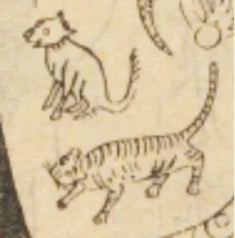 宗彝,即虎、蜼,蜼是一种长尾猿猴,“虎取其严猛,蜼取其智”。北宋邢昺注疏,彝是古代盛酒礼器的总称,两晋郭璞注,宋代邢昺《尔雅注疏》载:“别酒尊大小之异名也。彝其总名。彝者,法也,与诸尊为法。”《礼书》也描绘了宋代的六彝,分别是“鸡彝、鸟彝、斝彝、黄彝、虎彝、蜼彝”,即在不同的盛酒容器上绘画或刻印鸡、鸟等纹样或形状。其中,虎彝和蜼彝最古老,早在尧舜时期它们就被视为宗庙彝尊之饰,象征着宗庙社稷,故美其名曰“宗彝”。十二章纹的宗彝就是以虎、蜼为纹样,宋《舆服志》甚至直接以“虎蜼”代称“宗彝”。冕服之宗彝,目前最早的见于《三礼图》冕服上,它们并非以祭器的形式,而是虎、蜼二纹一上一下分别对称存在于冕服袖口两端,虎为走姿,蜼是坐姿(图15)。而《礼书》的虎、蜼则是绘于彝,即祭器上,与酒杯构成整体纹样饰于冕服(图16),其形象模糊不清。