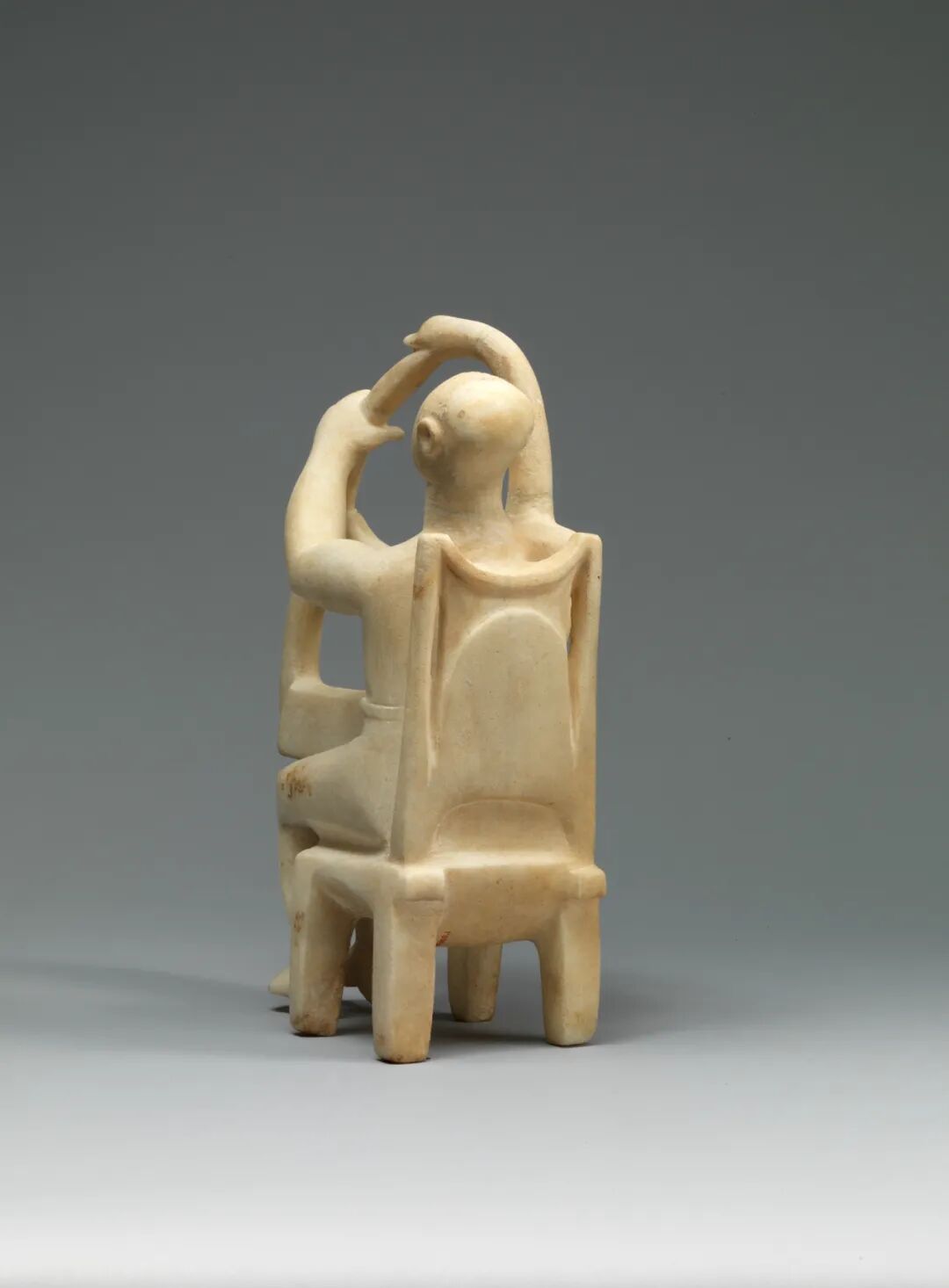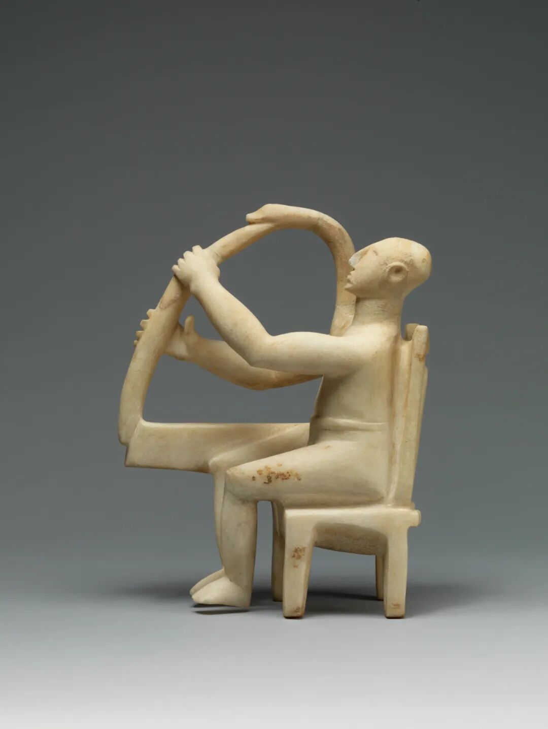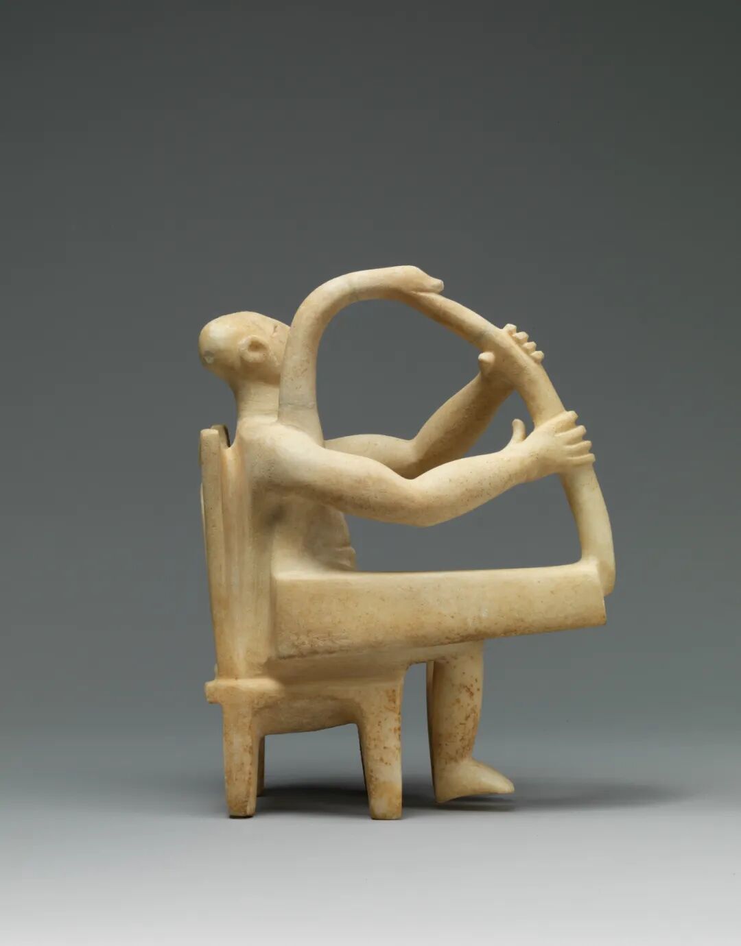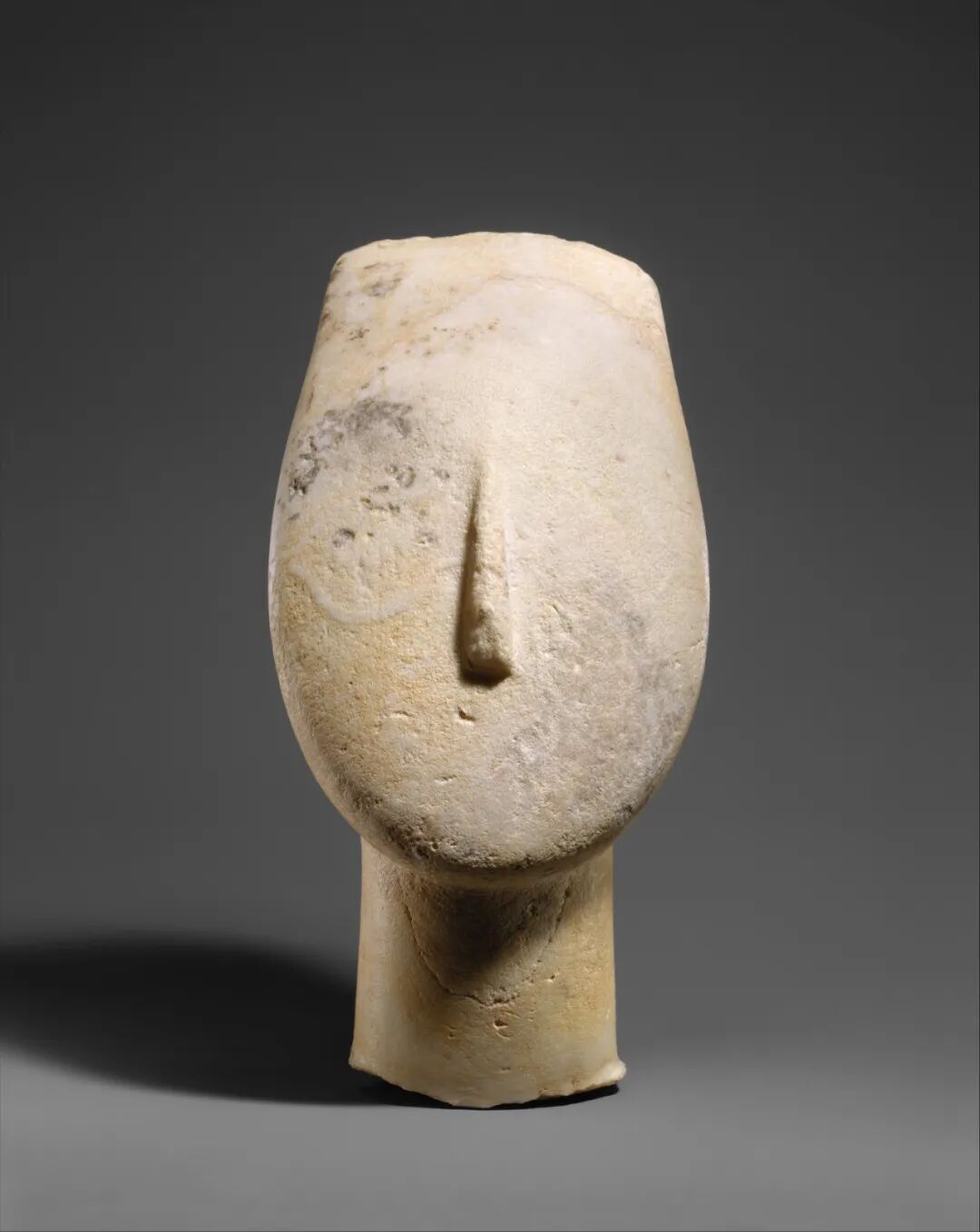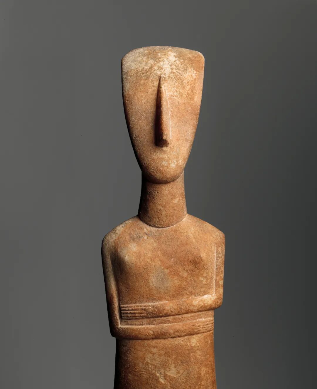 基克拉迪文化属于希腊青铜时代文化(公元前3200—前1100年),在青铜时代的早期,爱琴海中部的基克拉迪群岛形成了基克拉迪文明,其特征之一就是大理石雕像系列,这些雕像的共同特点是有着七弦竖琴型的头部,但是没有眼睛、耳朵和嘴,较长的鼻子呈半圆锥体形。身体没有太多细节,只有一些凹刻的线条可以区分双臂、双腿、脊椎等部位。这些高度抽象的人像令人着迷。