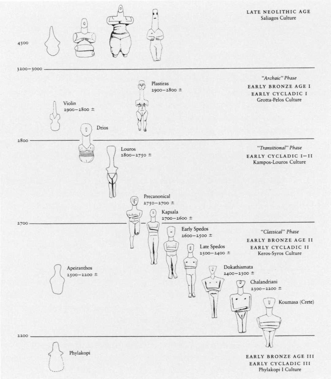 早期基克拉迪文化可分为两个主要阶段,格罗塔-佩洛斯(早期基克拉迪一世)文化(约公元前3200-2700年)和克洛斯-西罗斯(早期基克拉迪二世)文化(约公元前2700-2400/2300年)。这些名字与重要的埋葬地点相对应。不幸的是,在基克拉迪早期发现的定居点寥寥无几,而关于这种文化的大部分证据来自于岛民与死者一起埋葬的各种物品,主要是大理石器皿和雕像。墓葬品的质量和数量的不同表明了财富的差异,这表明当时在基克拉底群岛出现了某种形式的社会等级。