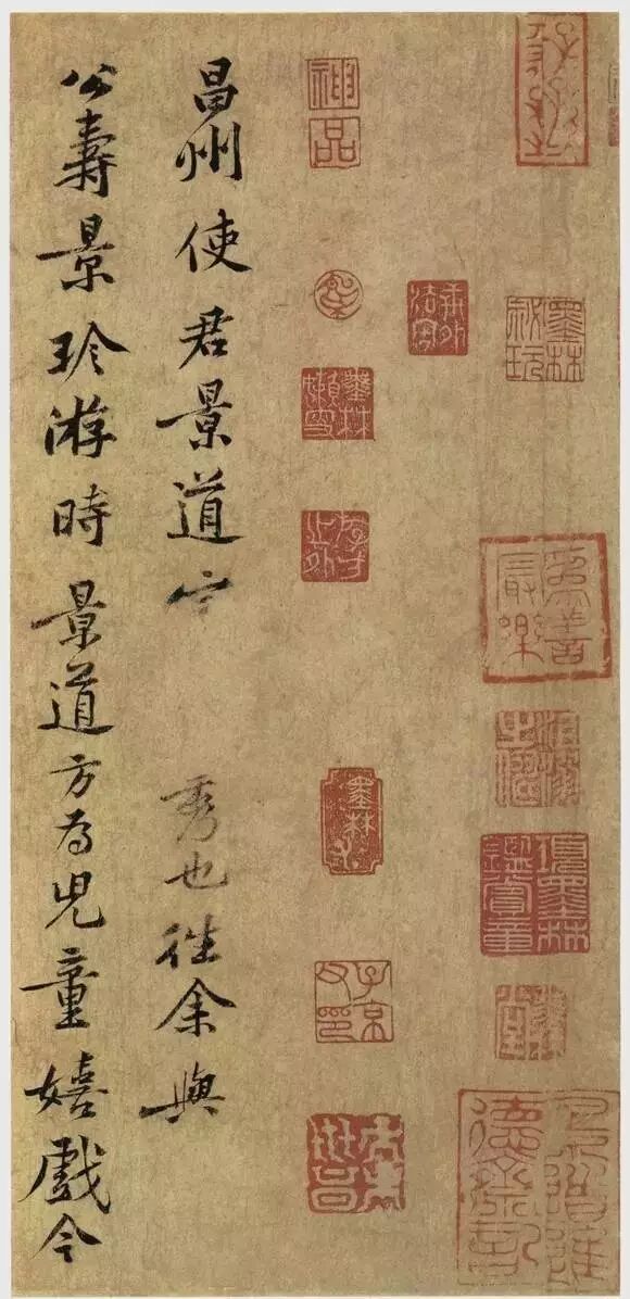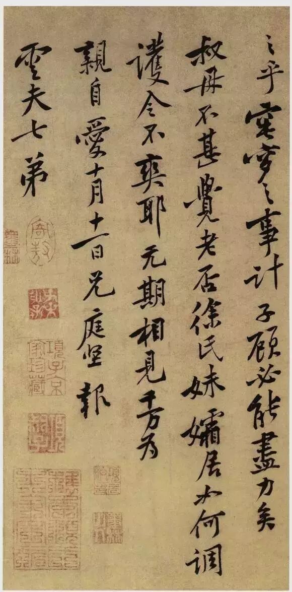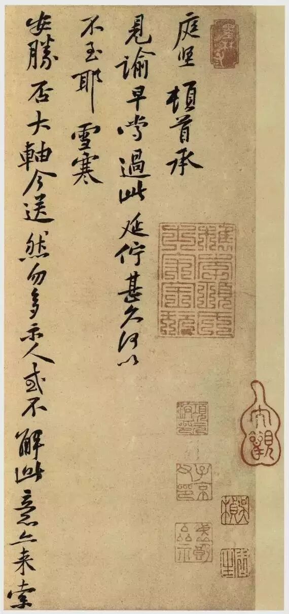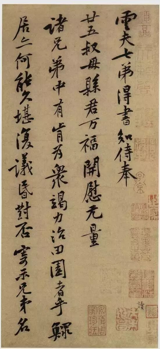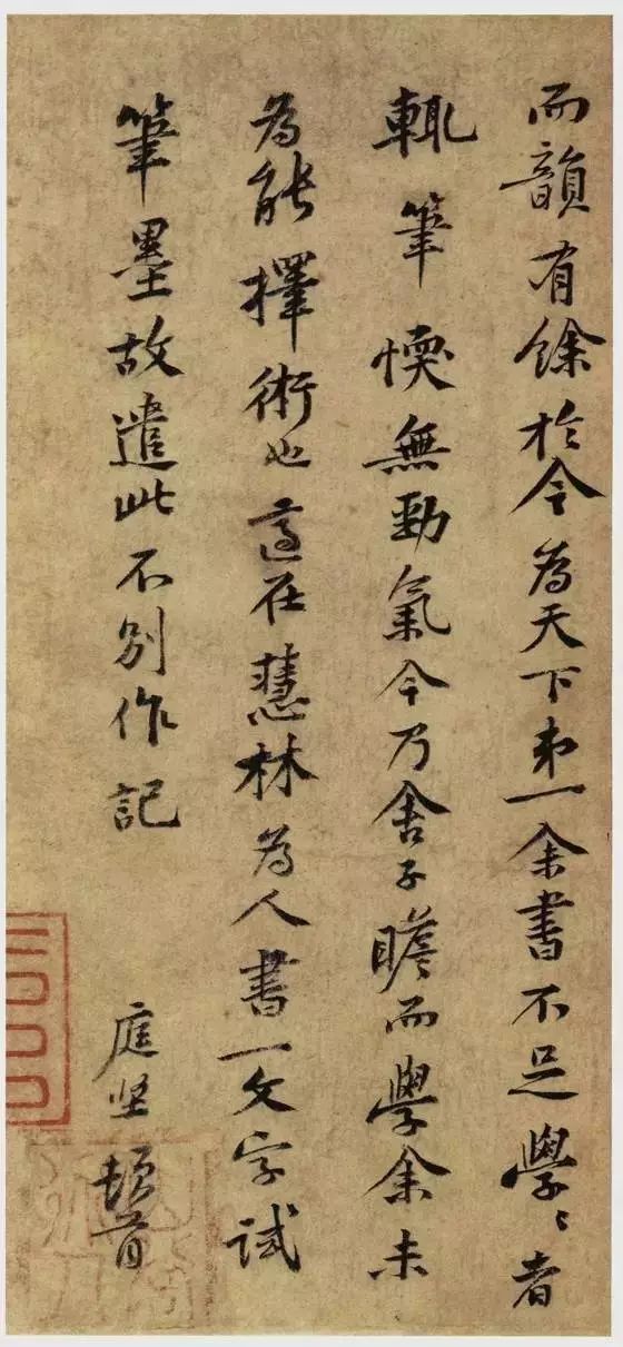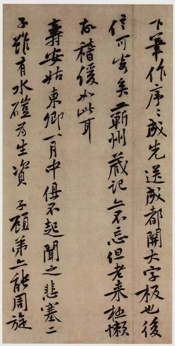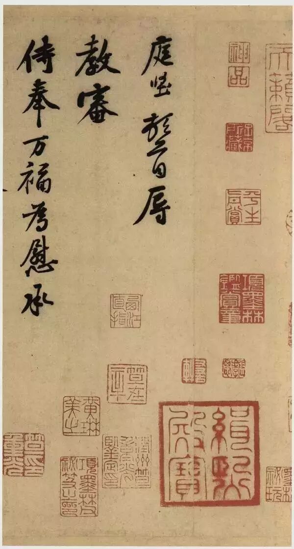 黄庭坚在上溯晋唐、学习前人经典书法时,对其影响最大的莫过于苏轼,可以说黄庭坚的手札小行书在很大程度上是学苏轼的。黄庭坚作为“苏门四学士”之一,不能不受苏轼书风的影响。在黄庭坚书论中,评东坡书颇多,且多为推崇备至者。苏东坡不仅是黄庭坚文学上的老师和提携者,而且也是其书法的学榜样。在黄庭坚题跋中,即反映出黄庭坚从苏轼处学习书法的一些消息,如“予与东坡俱学颜平原。然予手拙,终不近业”,又如“东坡此帖,甚似虞世南公主墓铭草。余尝评东坡善书乃其天性。往尝于东坡见手泽二囊,中有似柳公权、褚遂良者数纸,绝胜平时所作徐浩体字。又尝为余临一卷鲁公帖,凡二十纸,皆得六七,殆非学所能到”。黄庭坚与苏轼相差八岁。二人交谊师友之间。从黄庭坚流传至今的行帮手札墨迹看,其撇捺开张、字形扁阔、字势向右上扬等,都明显表现出苏轼书法的特征,甚至有些夸张强调,唯嫌生涩,未有苏书圃熟也。而黄庭坚以禅悟书当与苏轼互为影响。如苏轼《祷雨帖》,笔意极似黄庭坚,特别是其末尾数字,从容娴雅,行笔松缓,几若黄庭坚代笔。