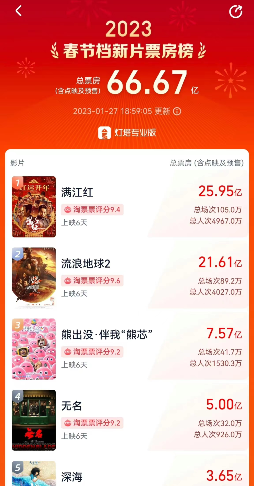春节假期落下帷幕,春节档电影票房排行榜也随之出炉。《满江红》、《流浪地球2》以及《熊出没》位居前三。