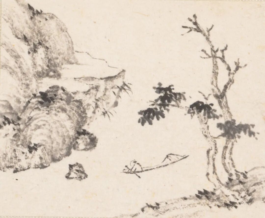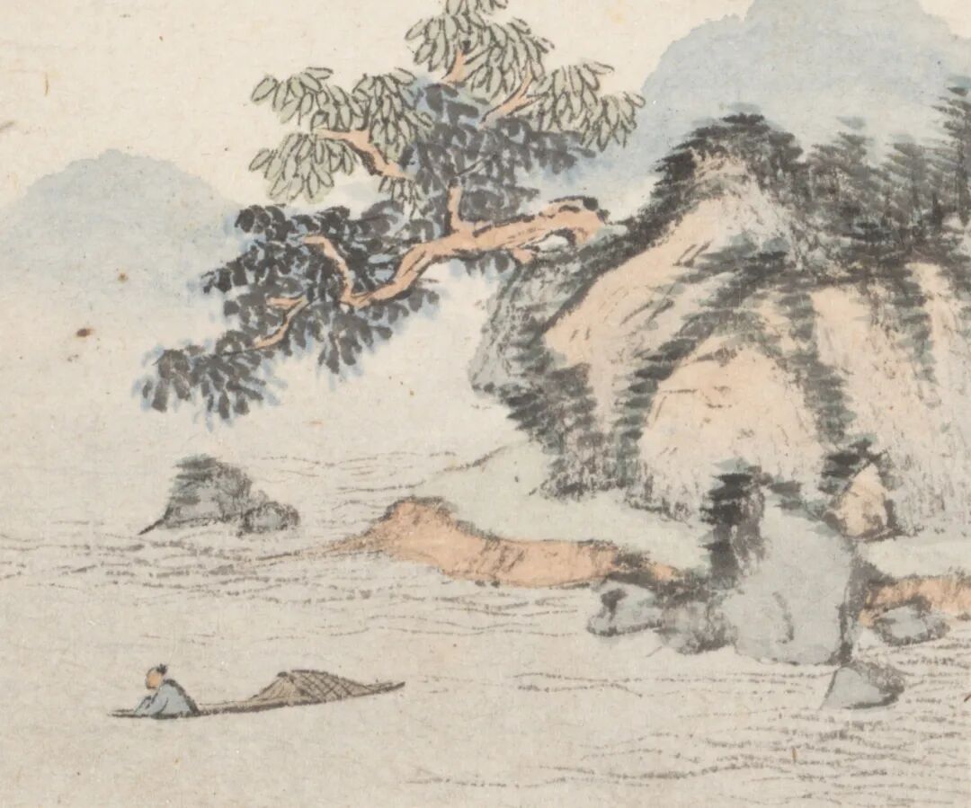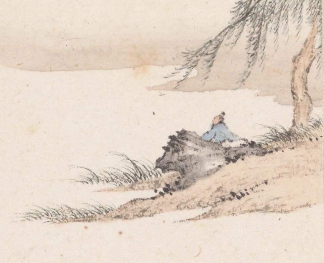 张宗苍这组册页非常小,画面笔墨清新,设色淡雅,岗峦洲渚,坡石草亭,悠人荡舟,小泉流淌,给人一种恬淡宁静之感。![]()