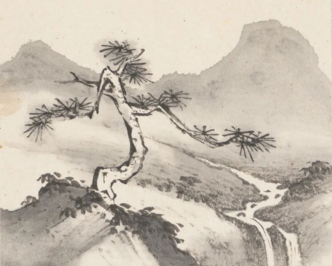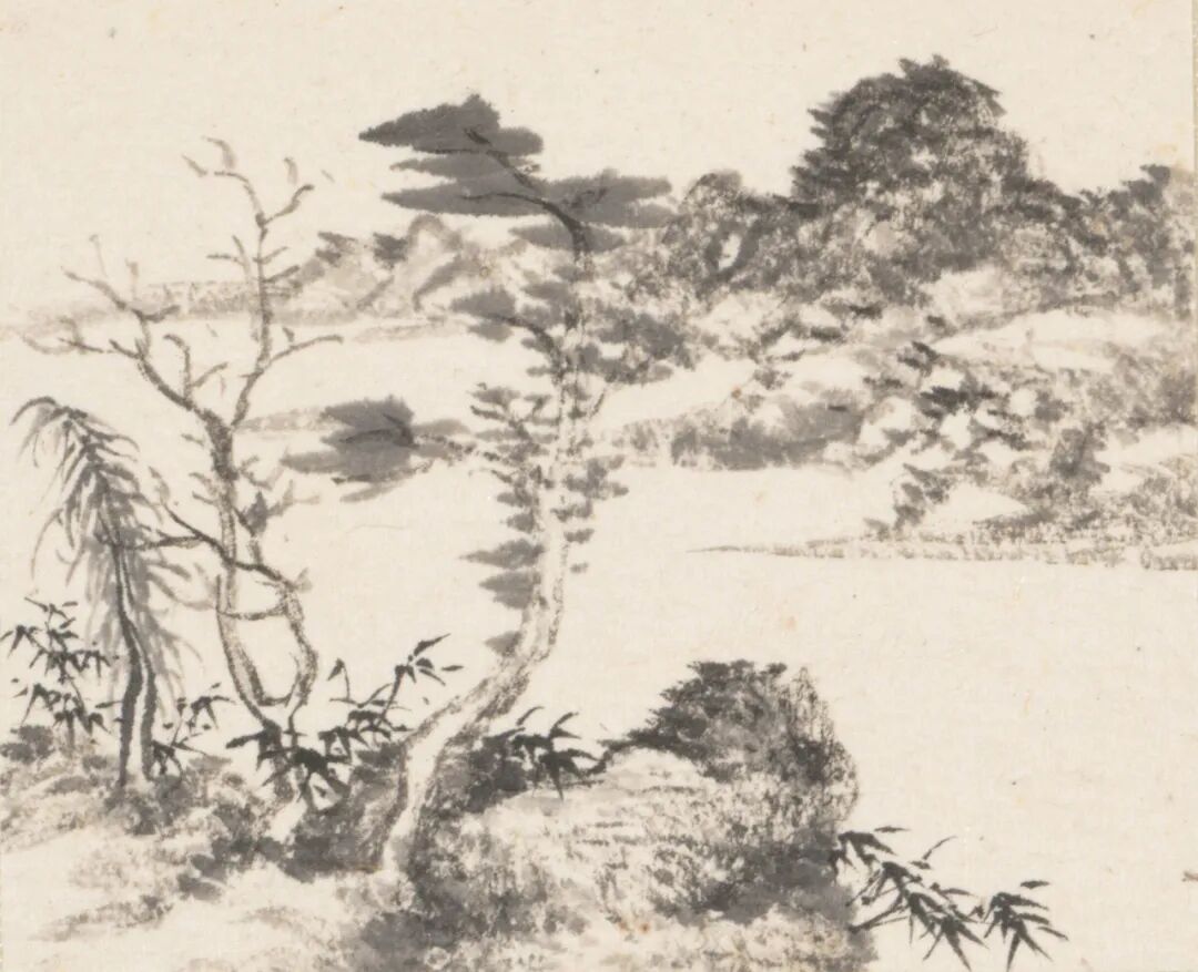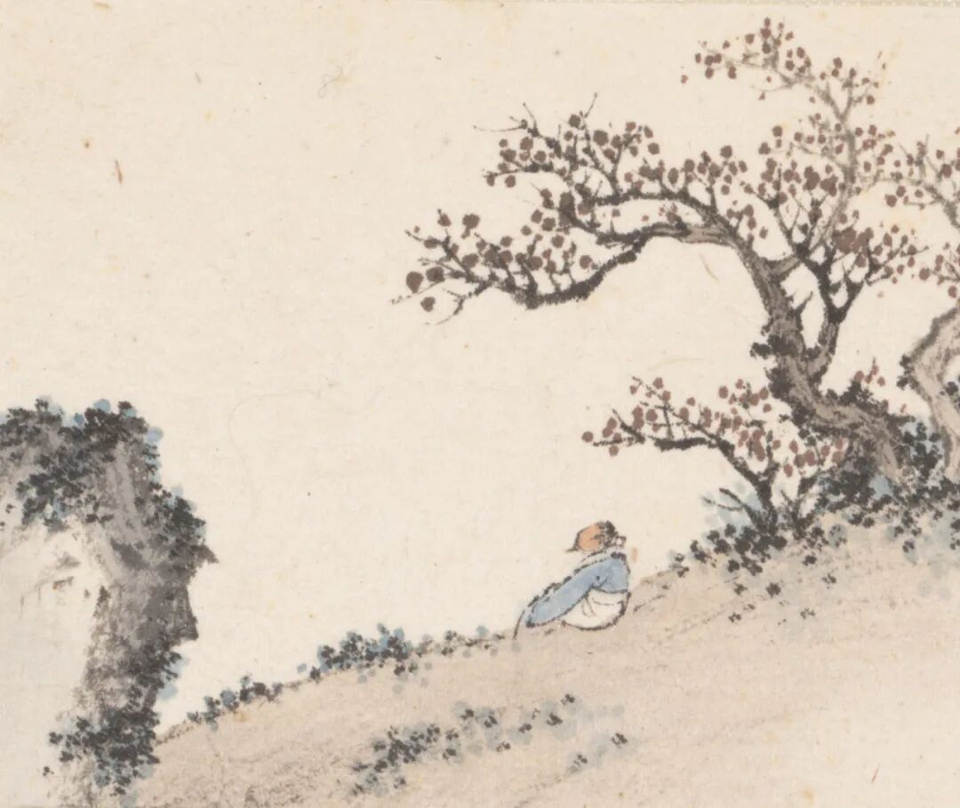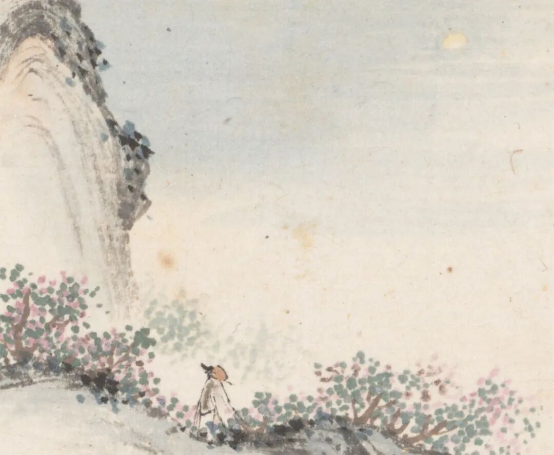 张宗苍这组册页非常小,画面笔墨清新,设色淡雅,岗峦洲渚,坡石草亭,悠人荡舟,小泉流淌,给人一种恬淡宁静之感。![]()