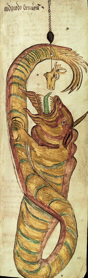 ▲ [丹] 洛伦兹·弗罗利希《独臂神提尔站在巨狼芬里尔前面》,1895年,版画二人到达希密尔家后,得到了提尔母亲的热情款待。提尔的母亲美丽动人,她原本来自阿萨神族,只是当年出于无奈才下嫁给巨人希密尔。她见索尔是同族,便提醒他,她的丈夫恐怕不会善待访客,并嘱咐他只要见到希密尔瞪眼,就赶紧躲到柱子后面,否则会被巨人犀利的目光杀死。希密尔回到家后,闻听有人来借锅,欣然应允,但开出的条件是索尔必须证明他有足够的力气扛走大锅。▲ 民族大迁徙时期的金币图案“提尔被芬里尔咬掉胳膊”,公元5世纪,瑞典西约特兰出土索尔要求先吃饱肚子方可显示神力,结果他一口气吃下两头牛,搞得希密尔家中再无食物。希密尔决定先带着索尔出海钓鱼,补充家用。二人将船划到深海之上,希密尔钓起两头巨鲸,不由得洋洋得意。此时,索尔正不紧不慢地垂下钓竿,用牛头当诱饵,用铁链当鱼线,不一会儿便将中土巨蟒钓出海面。▲ [冰]《耶梦加得被牛头诱饵钓起》,17世纪,手抄本插画冰岛雷克雅未克 rni Magnússon 研究所藏雷神和中土巨蟒,一人一怪,对峙良久,希密尔早就吓得缩在船尾,瑟瑟发抖,体似筛糠。▲ [冰]《索尔钓起了中土巨蟒》,1765-1766年,手抄本插画冰岛雷克雅未克 rni Magnússon 研究所藏▲ [德] 约翰·亨利希·菲斯利《雷神重创中土巨蟒》,1788年,布面油画,131 x