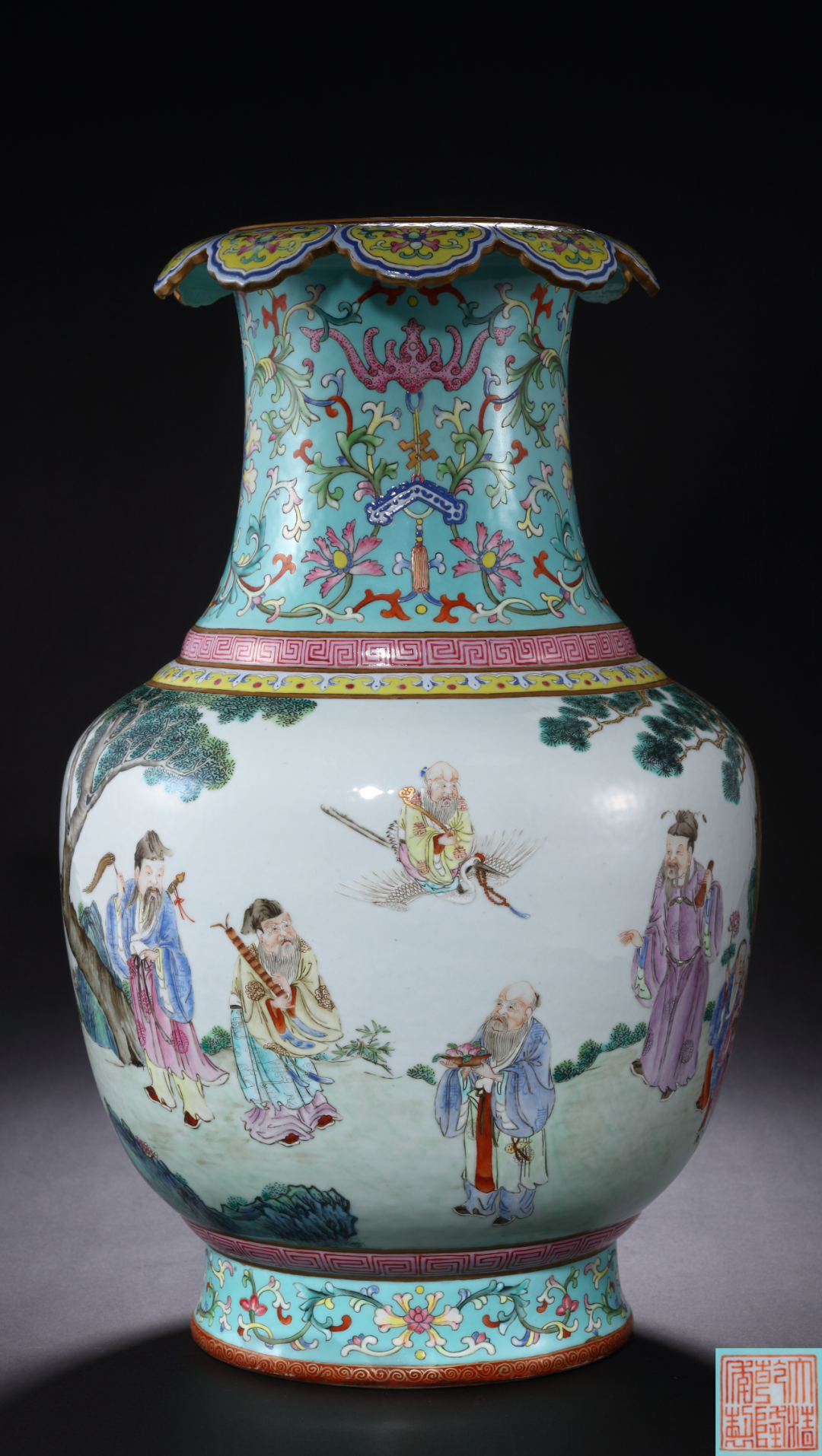 此瓶撇口束颈,丰肩鼓腹,下敛至足,足部外撇。器身主体以洋彩绘群仙祝寿通景纹样,南极仙翁手持如意,乘鹤翩翩而来;福禄寿三星齐聚一堂,八仙各持法器,笑意盈盈,神采奕奕;寒山、拾得和合二仙一持荷花,一持宝盒,寓意家庭和美、社会和谐。众人皆向乘鹤而来的寿老方向。器型别致处,乃于口沿装饰相连的八个翻口如意云头,于黄地上彩绘花卉纹;颈部及足皆以松石绿为地,绘花卉纹样,上下呼应,如卷轴之画绫,使主体纹样更为凸显;颈部间饰蝙蝠衔磬及「卍」字,寓意吉庆有余。足内亦施松石绿釉,中间以红彩书“大清乾隆年制”六字三行篆书款。