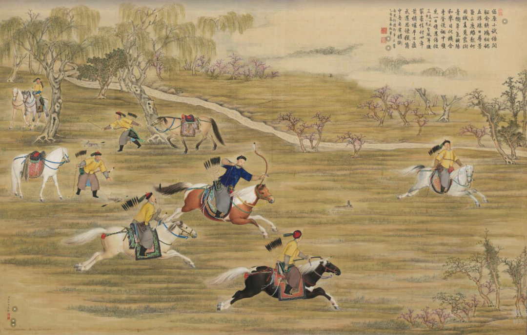 乾隆皇帝对鹿的喜爱,实际体现了满汉不同文化在他思想中的融合。满清崛起自关外,骑射渔猎为其最基本的生活技能,那片白山黑水间的沃土也被称为满族的“龙兴之地”,无怪乎乾隆帝将“骑射”视为祖宗家法和立国之本,他曾说:“骑射为我朝家法,每谆谕子孙当万年遵守。是以予虽年逾古稀,必岁幸木兰行猎。盖以身先之,不敢自逸。”他提及的“木兰行猎”即为清代十分重要的“木兰秋狝”,这是一个满汉语的混称,“秋狝”汉语指皇家秋天的狩猎活动;“木兰”是满语的音译,原意为“哨鹿”,是满洲人的一种传统狩猎方式,即狩猎时头戴鹿角面具,以木制长哨模仿雄鹿求偶之声,以引诱雌鹿寻偶而来,而雄鹿则夺偶而至,然后围而猎之。
