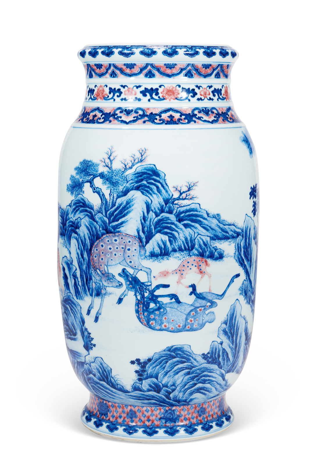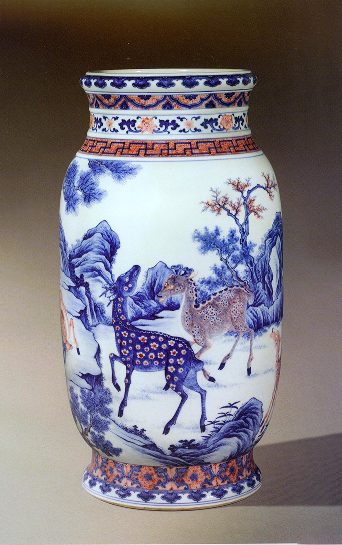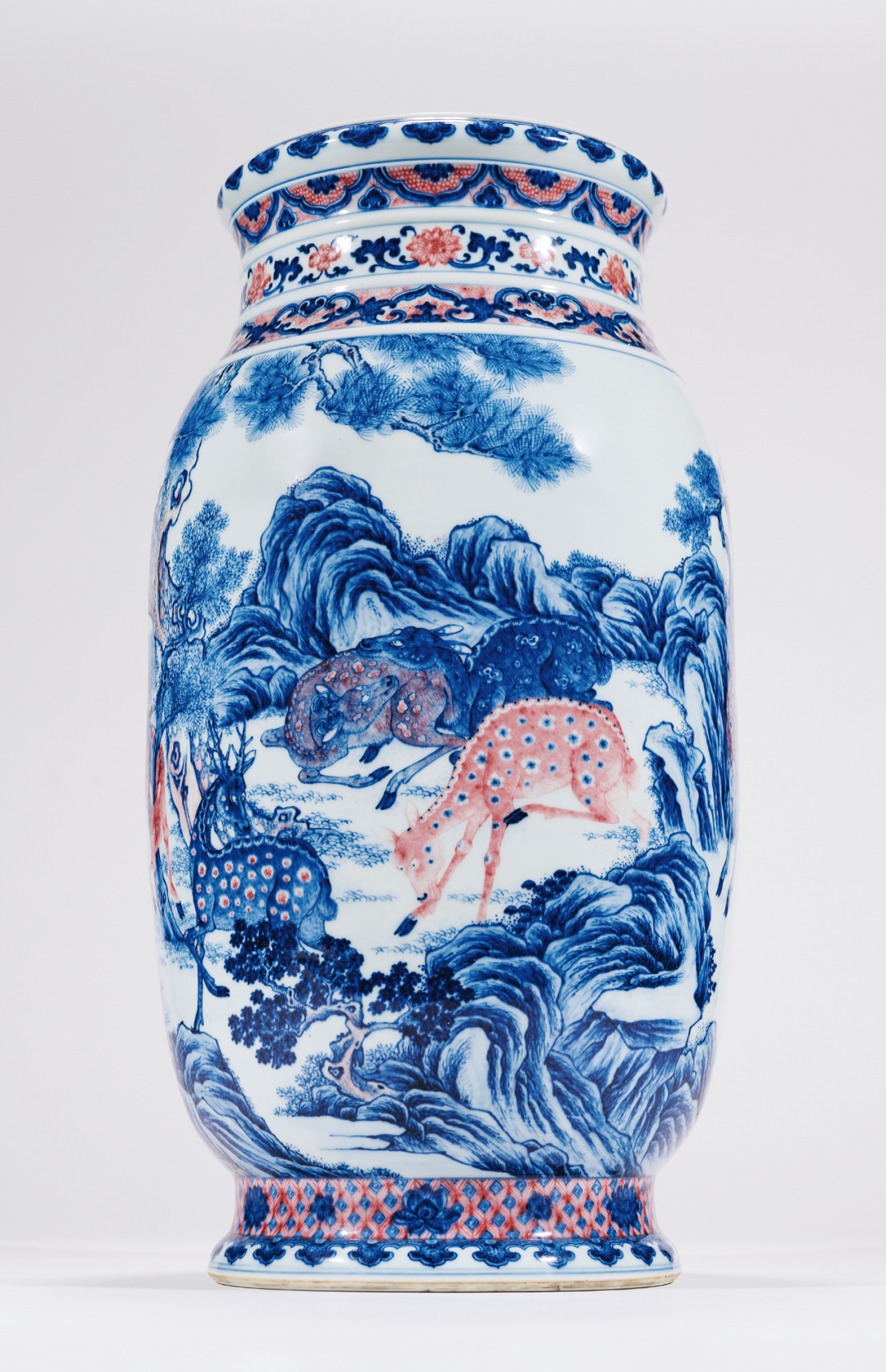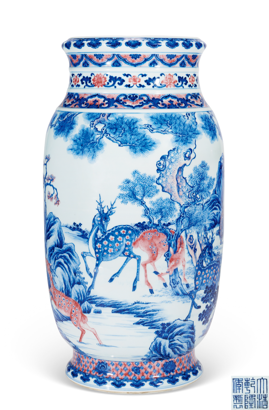 左图:香港望星楼藏 清乾隆 青花釉里红松鹿图灯笼尊
