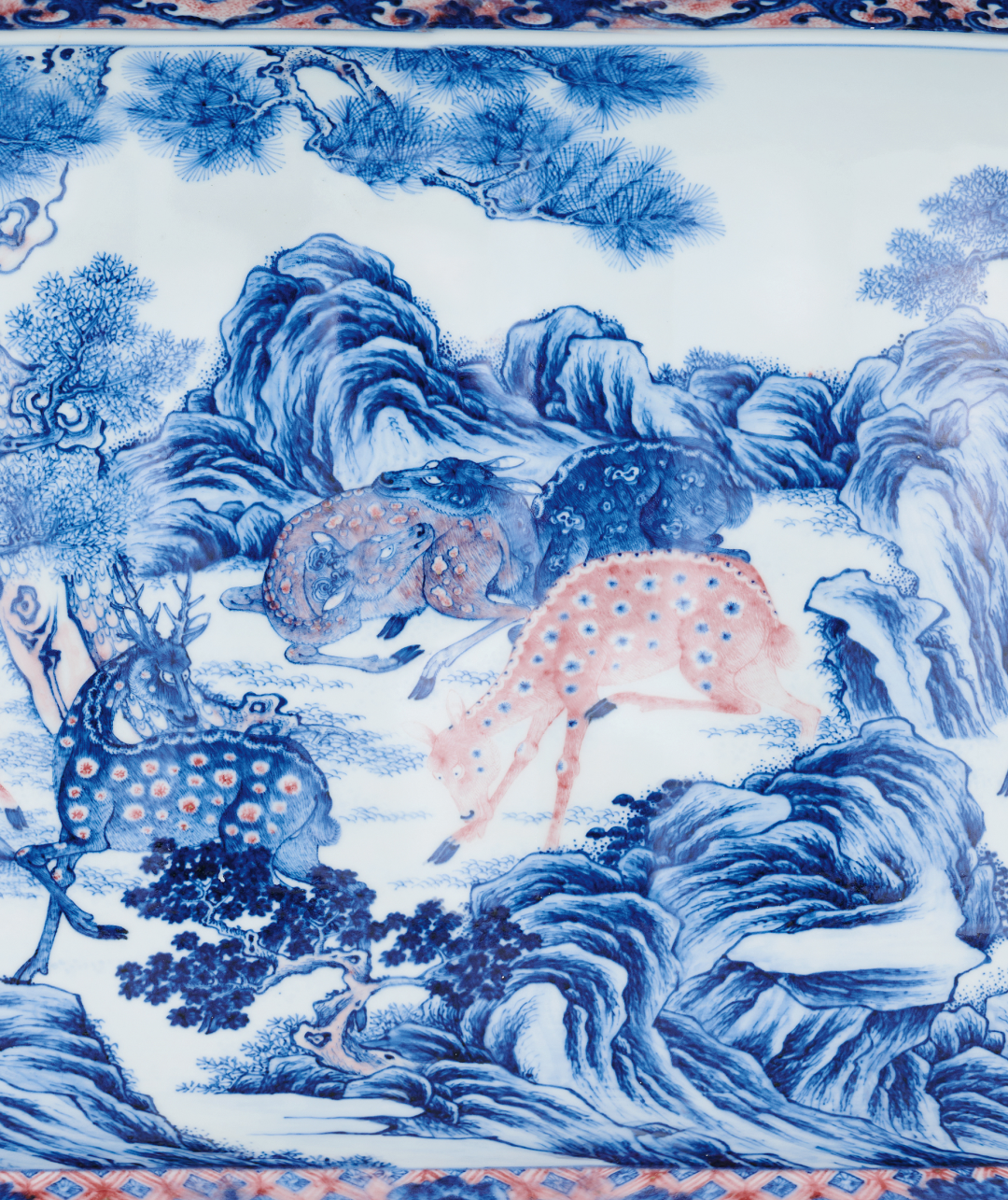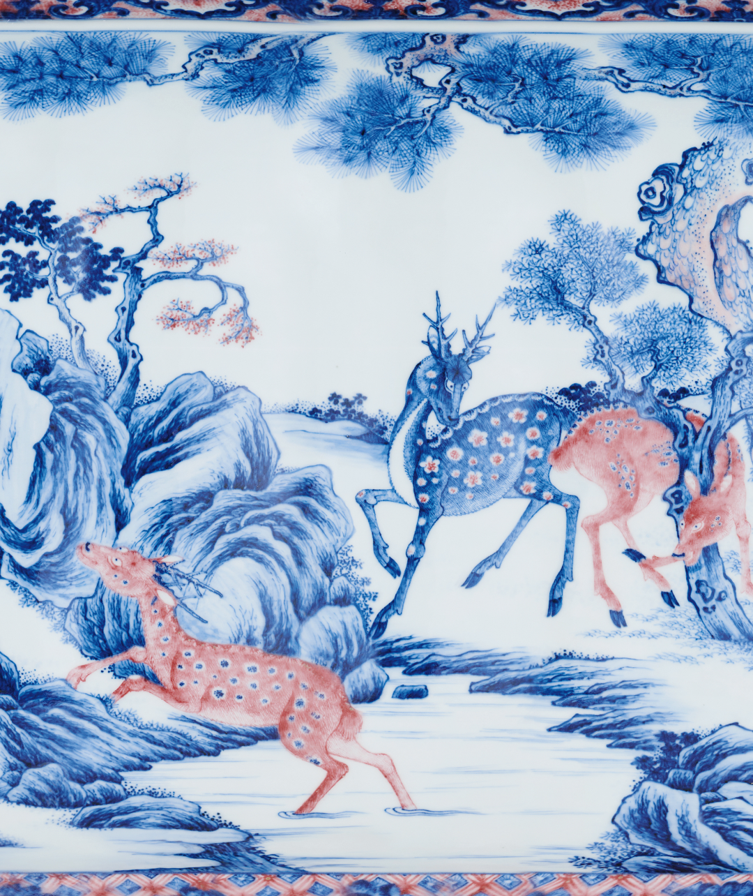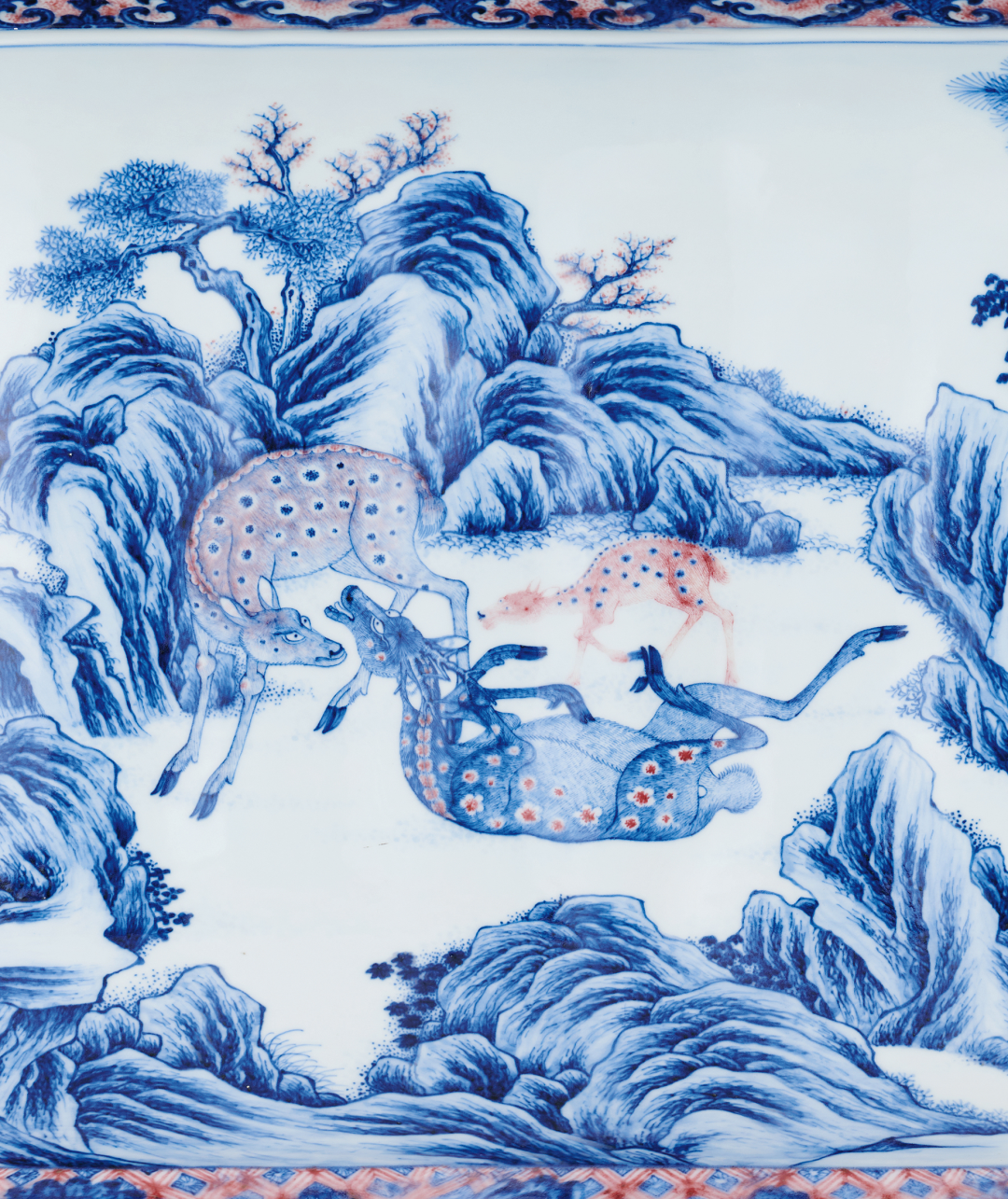 整器纹饰多以青花为之,间以釉里红填绘,色泽明而不媚,妍而不娇,画面气格淡逸、穆穆生韵。此式灯笼尊之造型形制端雅,腹身平直,尤宜展示长卷画面,瓶颈与足壁分别以青花釉里红绘如意头、卷枝莲花、框栏、对称夔龙、如意头等五层边饰,红蓝拼逗,相映成趣。器腹以青花釉里红绘就松鹿图,笔触绵密灵动,描摹分毫不差,见梅鹿十只或欢腾奔跃,或俯伏而憩,或呢喃依偎,或幼子食乳,各具情态,无不生动,于方尺间容象万千,实乃妙哉。观其釉色,青花与釉里红两者互为主次,可谓变化多端,搭配转换之妙,令人叹为观止。苍松巍立,怪石嶙峋,远山近景皆生动栩栩,青花发色浓淡相宜、渲染有度,真有“墨分五彩”之神妙。酌其用笔,勾皴点染无一不足,梅鹿鬃毛丝丝毕肖,拳石苍坚如嶂,苔草葱茏蓊郁,远山逶迤朦胧,臻乎自然之化境矣。故本品之青花、釉里红两者并胜,用笔卓尔不群,意境渊雅恬淡,兹盖世之佳作也。