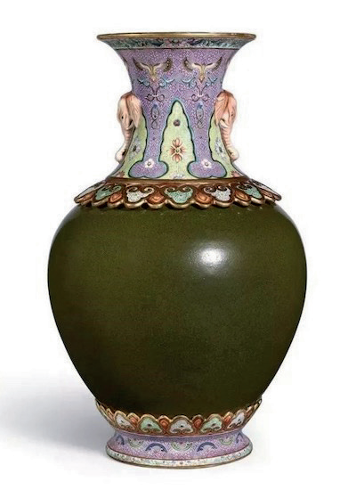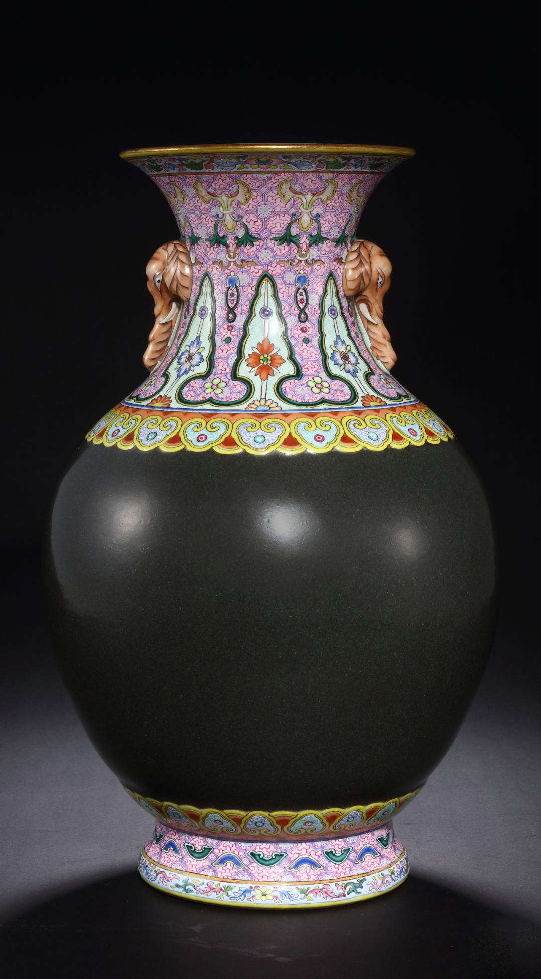 以洋彩搭配茶叶末釉的本器正是工艺繁复的创新之作。颈部以宫粉色为地,精心绘制的锦地细致且华美;其上衬独具西洋韵味的缠枝花卉并蝶纹,器腹上下各饰如意云纹一周,用色及纹饰精美。主体所施单色釉为厂官釉,俗称茶叶末釉,釉色深沉静穆;颈部两侧各贴塑一象耳,寓意太平有象。