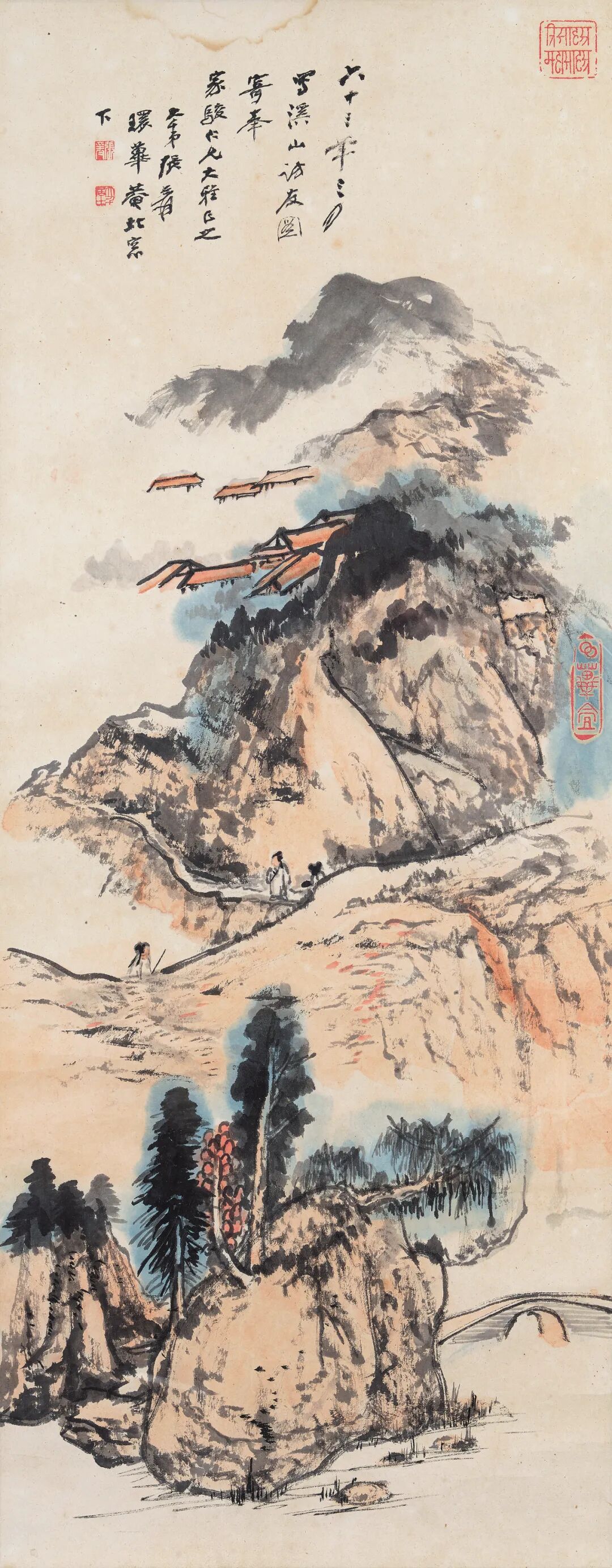 【题识】六十三年三月写溪山访友图,寄奉家骏仁兄大雅正之,大千弟张爰,环荜庵北窗下。