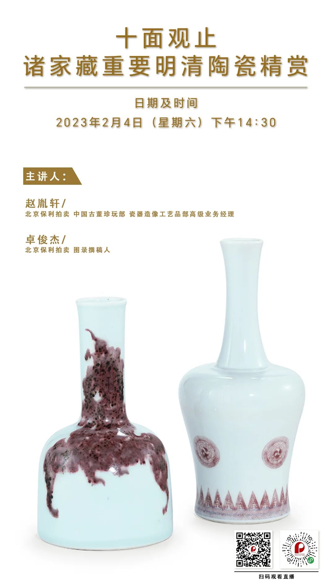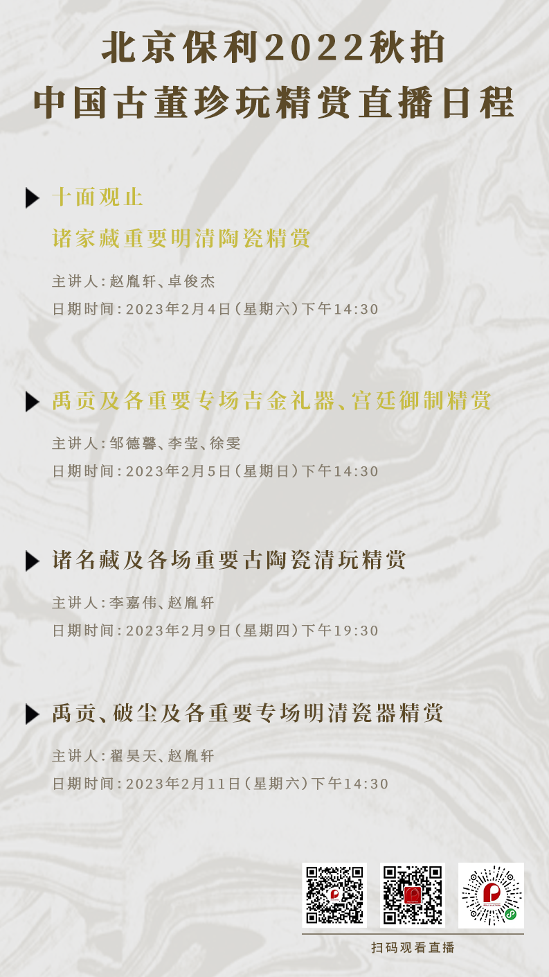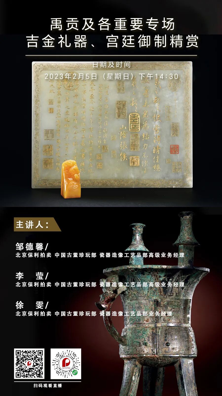 北京保利拍卖2022秋季艺术品拍卖会将于2023年2月18日正式拉开帷幕,诚邀各界藏家莅临预展现场。此次中国古董珍玩板块依旧异彩纷呈,从吉金礼器、宫廷御制珍玩到诸家珍藏古陶瓷等各个专场均为各界藏家带来了各个时期、各个门类的精品,部门专家希望借正月佳节喜气之机缘在网络上为各界藏家悉数介绍本次拍卖的明星拍品,希望广大古董珍玩藏友可以与我们在线上携手共赏佳器。