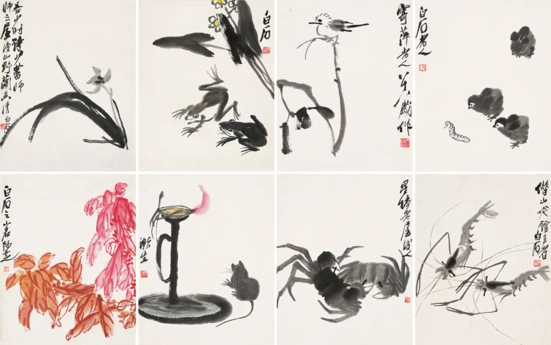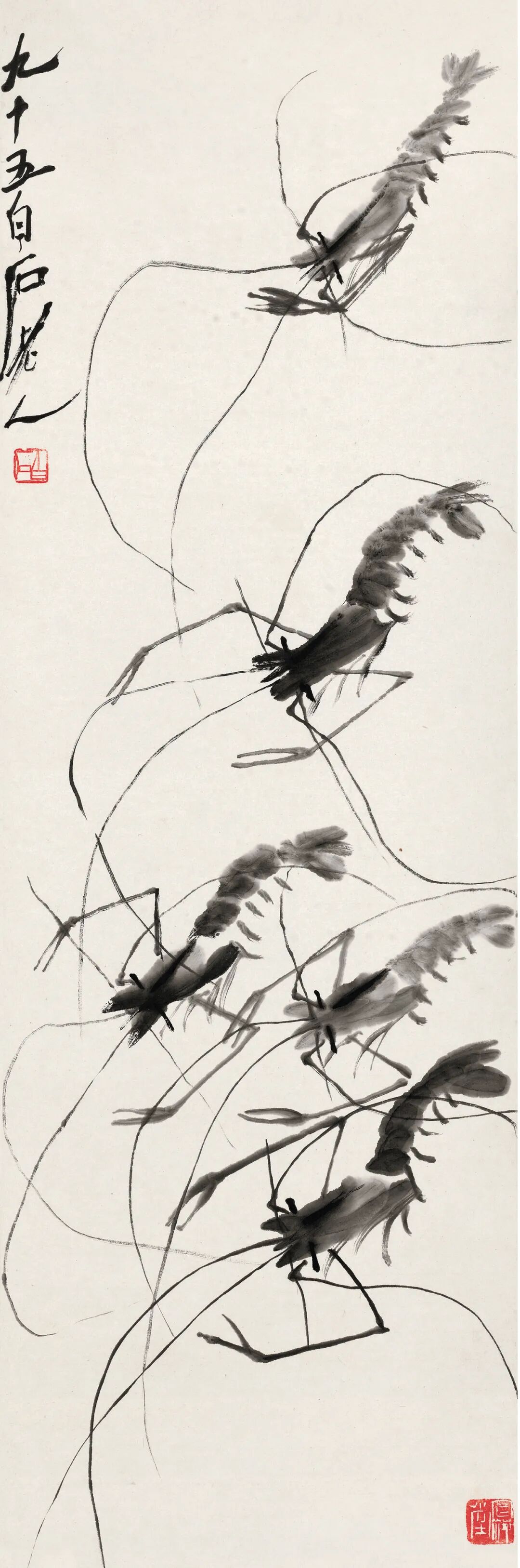齐白石又以画虾闻名。香港名收藏家黄大卫一生旧藏之《个个都成龙》与原澳门荣宝斋旧藏之《群虾图》均作于1955年,系齐氏画虾三变之后的最高峰,水墨的变化、须节的处理均已炉火纯青。与此同一轨辙的是同属介类的蟹。蟹壳、蟹甲、蟹足、蟹眼皆需细细经营,一笔不慎即满盘皆输。作于八十九岁的《蟹图》足资观照。