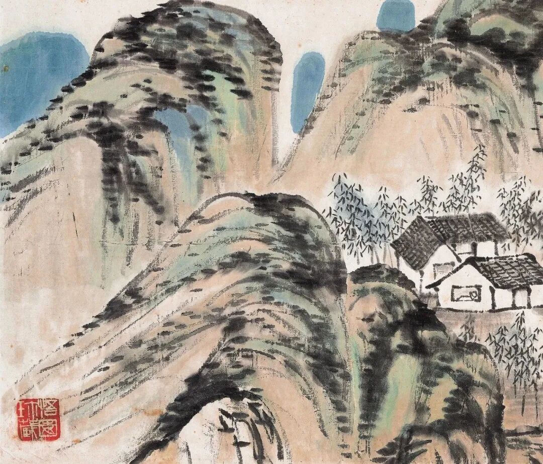 而与《悟园山舍图》大致同时的《白石老屋图》,以精到笔墨忆写心中家山,烙有浓重的思乡痕迹。本幅写家山壁立,一株梅从岩中生出,数丛竹自篱边向上,山下则两椽屋宇,一老一小相对立于屋前,情境极为生动,令人油然而生一段乡愁。