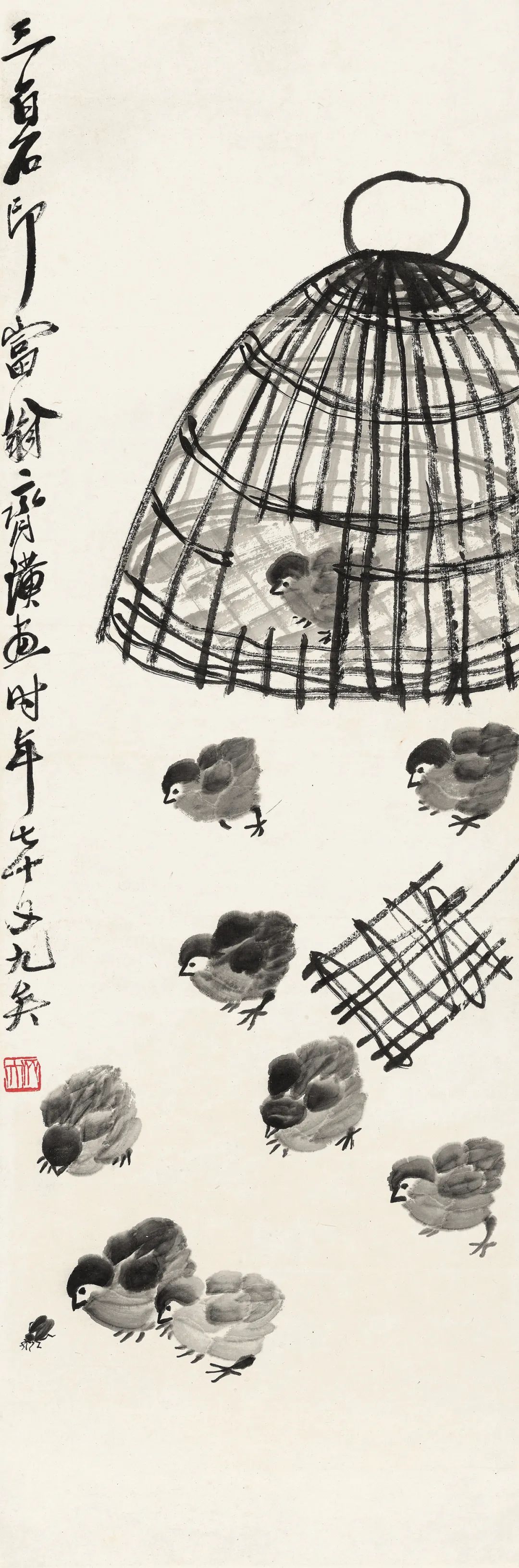 翎毛类自然也不在话下。1947年绘赠越南华侨瞿咸九的《月月见吉》,以淡墨杂浓墨写十二只雏鸡,神情动作无一雷同,笔墨间见生活;《名家翰墨》出版之《富贵寿考》写一尾绶带鸟飞越并蒂之牡丹,色彩清丽,寓意深深。