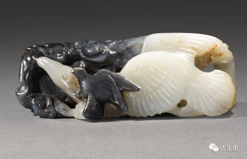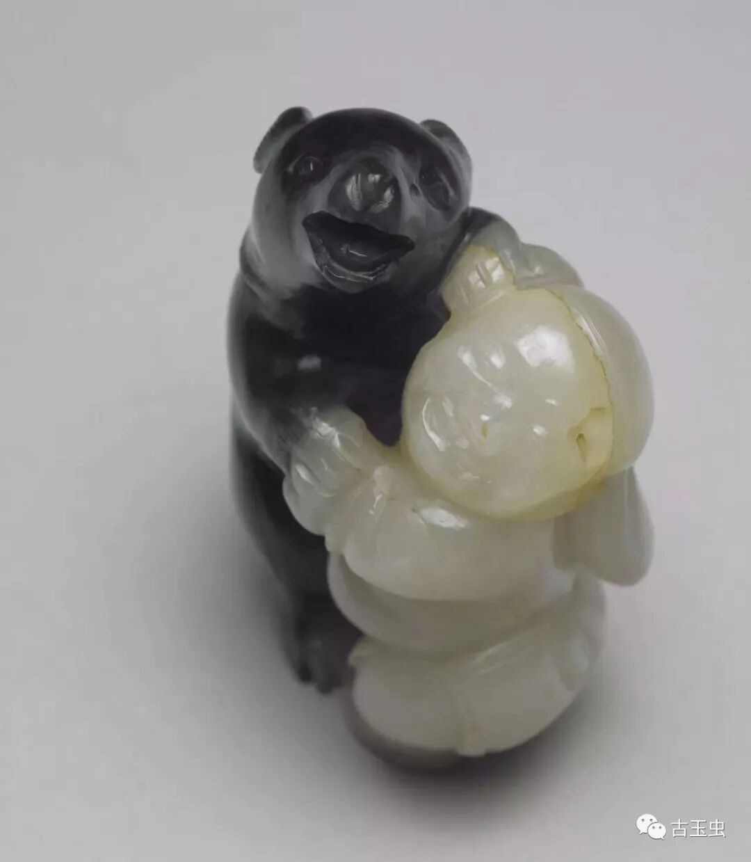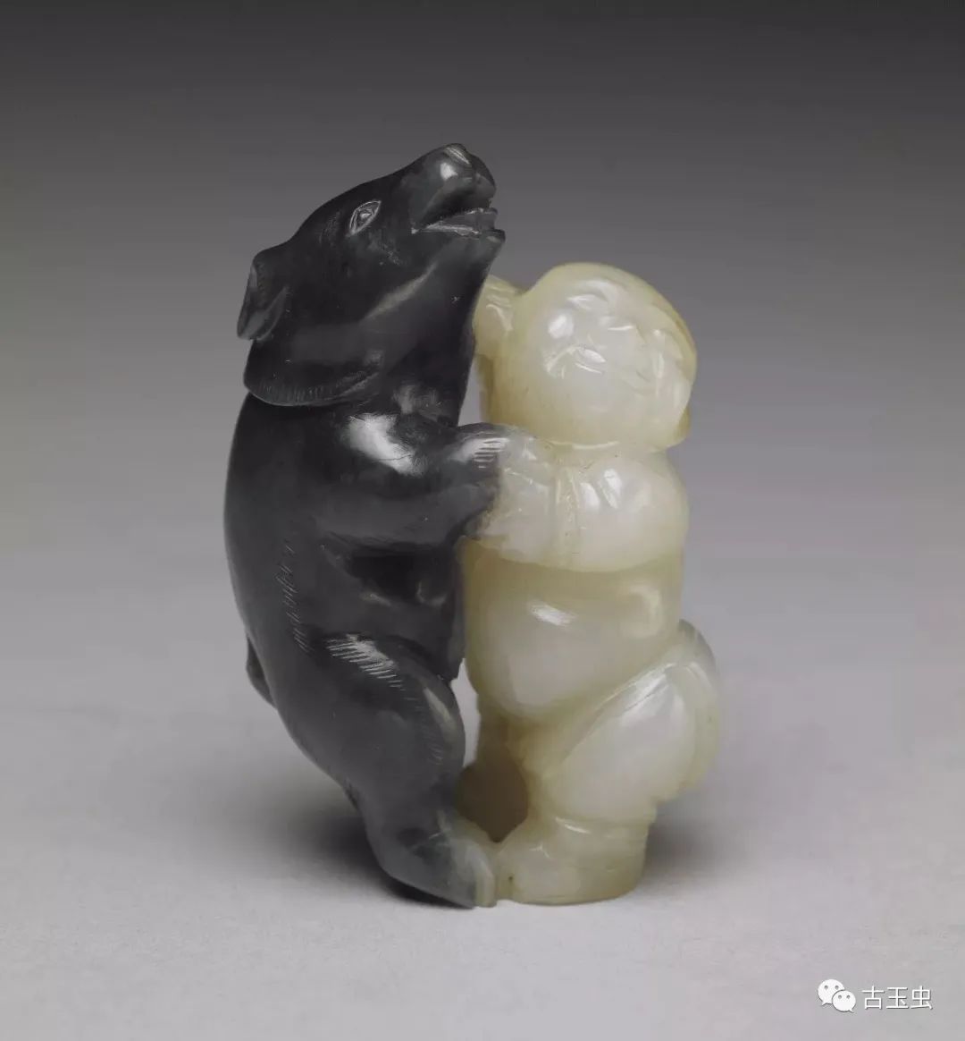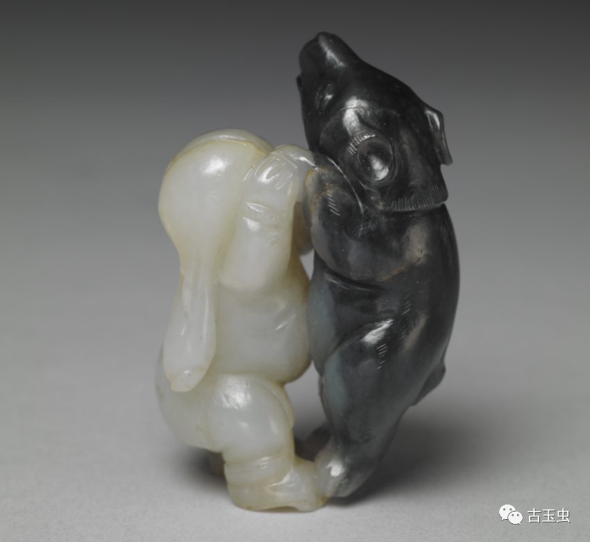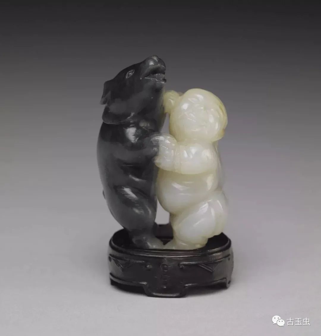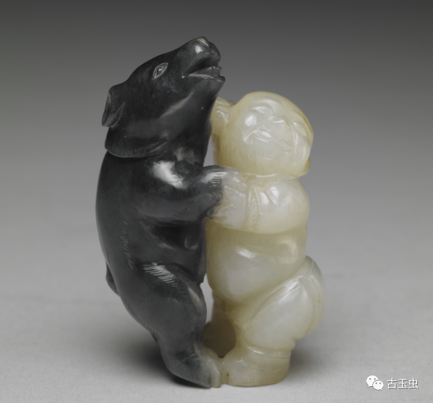 利用天然黑白两色玉石,以长线条雕出白玉人浑圆壮硕的体型;以短线阴刻黑玉熊毛茸茸的身躯。工匠以慧心巧思,雕出人与熊角力的瞬间。那一瞬间,不是紧张的肉搏,而是玉人与熊都笑了,手牵手地翩然起舞。此件玉雕,与其他小件古玩,贮于百什件中,显示百什件所收多为精巧好玩之物。