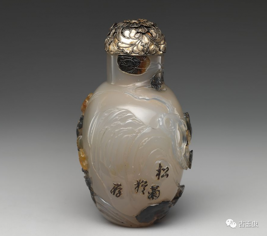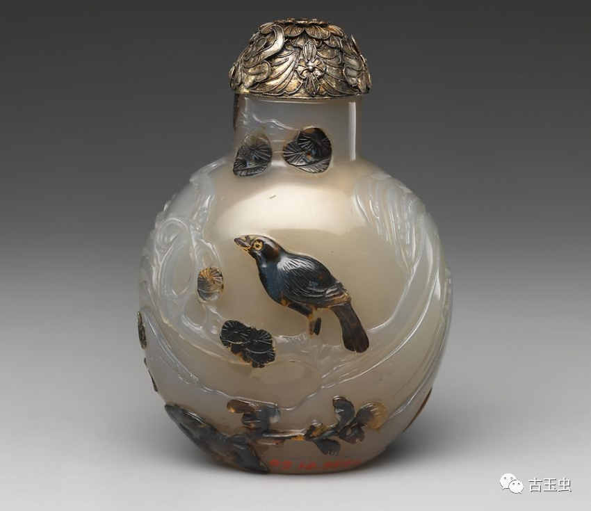 清 俏色巧雕花鸟玛瑙鼻烟壶(左侧) 美国大都会博物馆藏