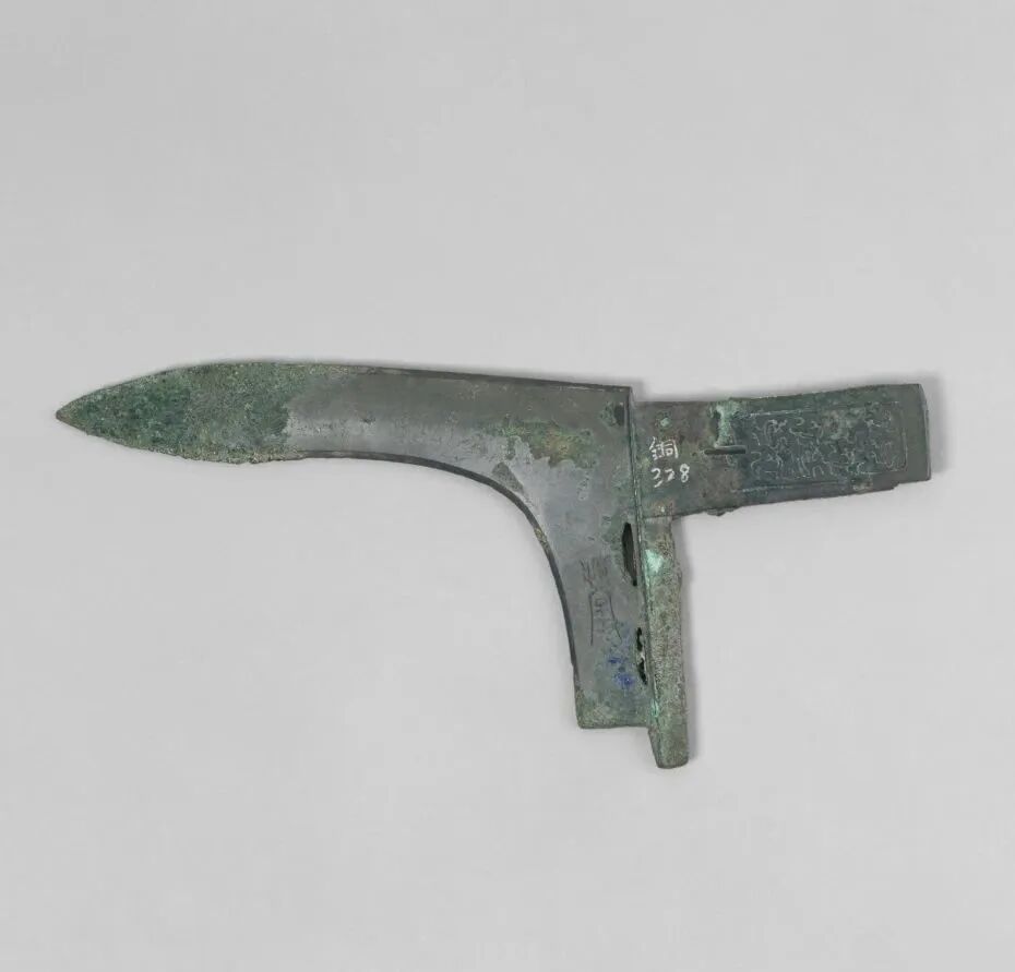 春秋时期诸侯争霸,兵器数量剧增,吴越工匠制作的兵器尤以精良著称。戈为兵器,此为戈头。鸟篆书盘旋曲折,极具艺术性。