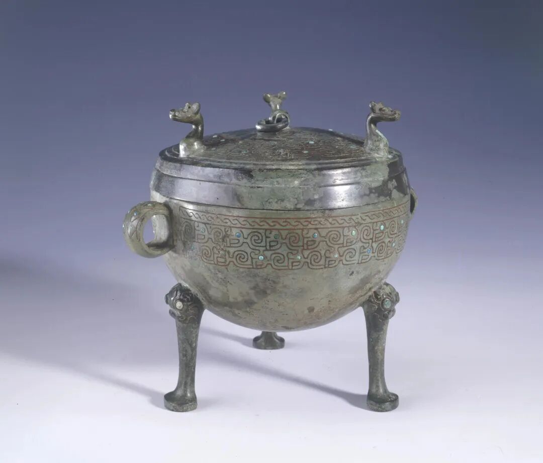 直口设平盖,盖面分置三个鹿首。细长的兽首蹄足。盖面和腹部装饰有红铜镶嵌的云纹和卷龙纹,龙目镶嵌有绿松石。整件器物纹饰精美,显示了当时高超的铸造技术。