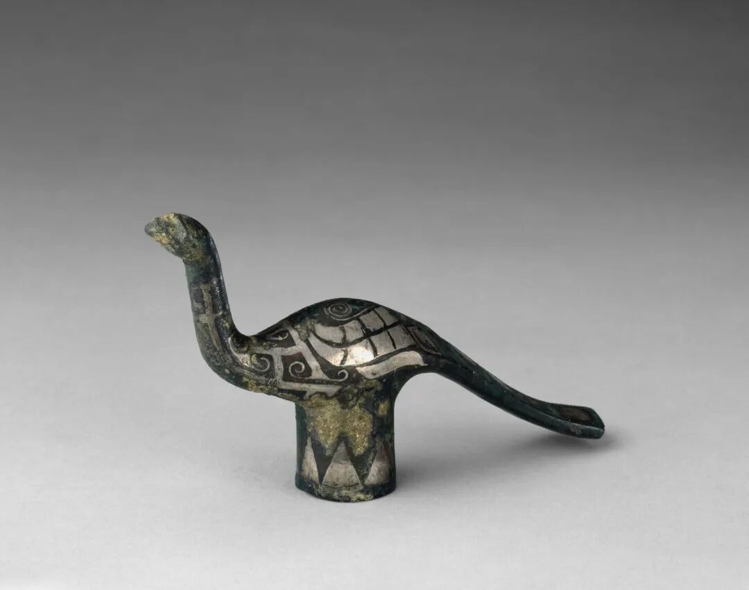 此为鸠杖饰件,鸠伸颈扬首,长尾。鸠身以银嵌饰羽纹和云纹。造型生动,制作精良。此为于省吾(字思泊)旧藏。