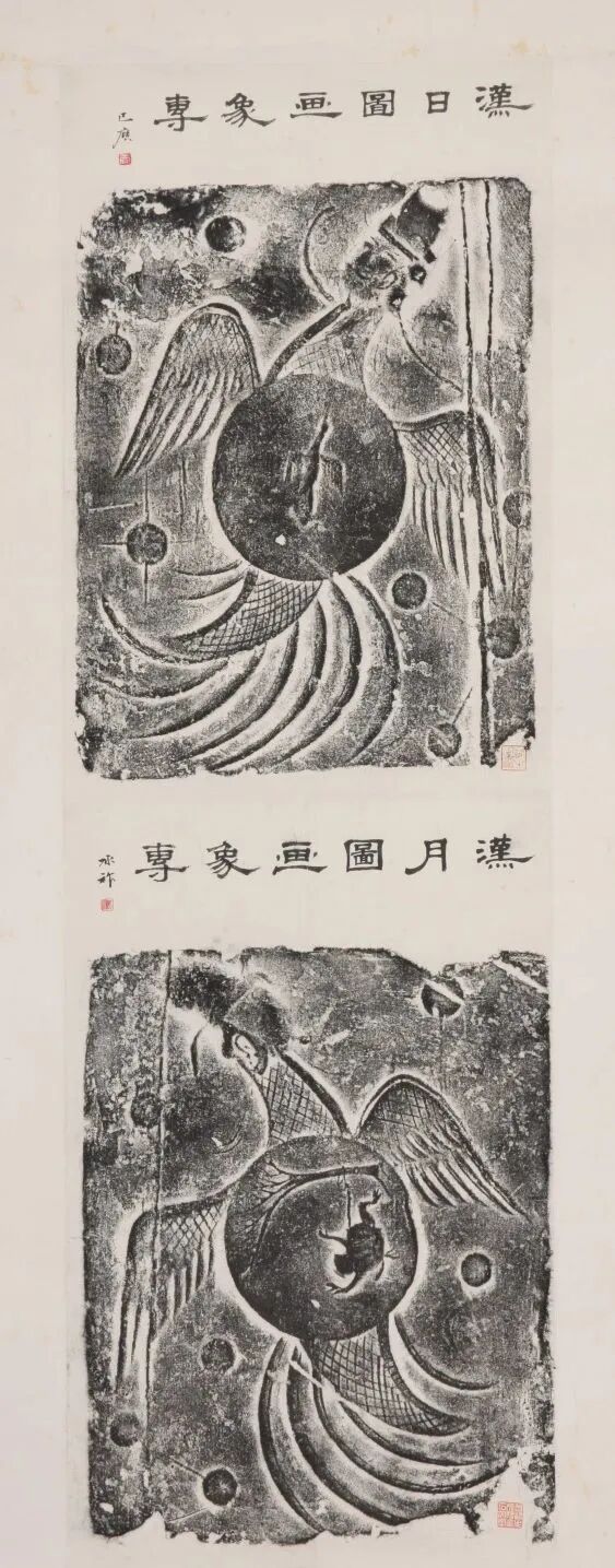 此件汉日图及月图画像砖拓片出于四川新津。日神羽人内为三足乌,月神羽人内为蟾蜍与桂树。《淮南子·精神训》载:“日中有踆乌,而月中有蟾蜍。”又东汉王充《论衡·说日篇》云“儒者曰:‘日中有三足乌,月中有兔、蟾蜍。’”