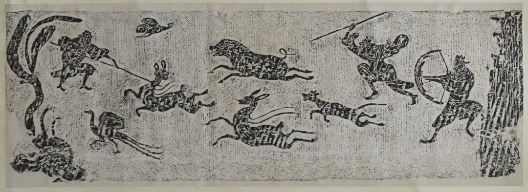 此件拓片出自四川新津汉代石棺,画面展现了欢快融洽的宴乐场景。宴饮助乐习俗,先秦就已有。《周礼·天官·膳夫》有“以乐侑食”的记载。汉代的宴饮助之风更浓,人们席地而坐,面前摆放低矮食案,分餐饮食,观乐舞、杂技以助兴。