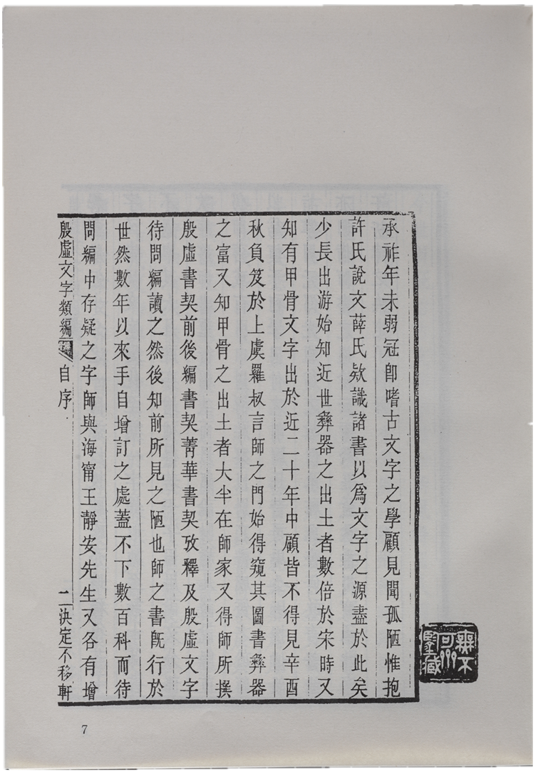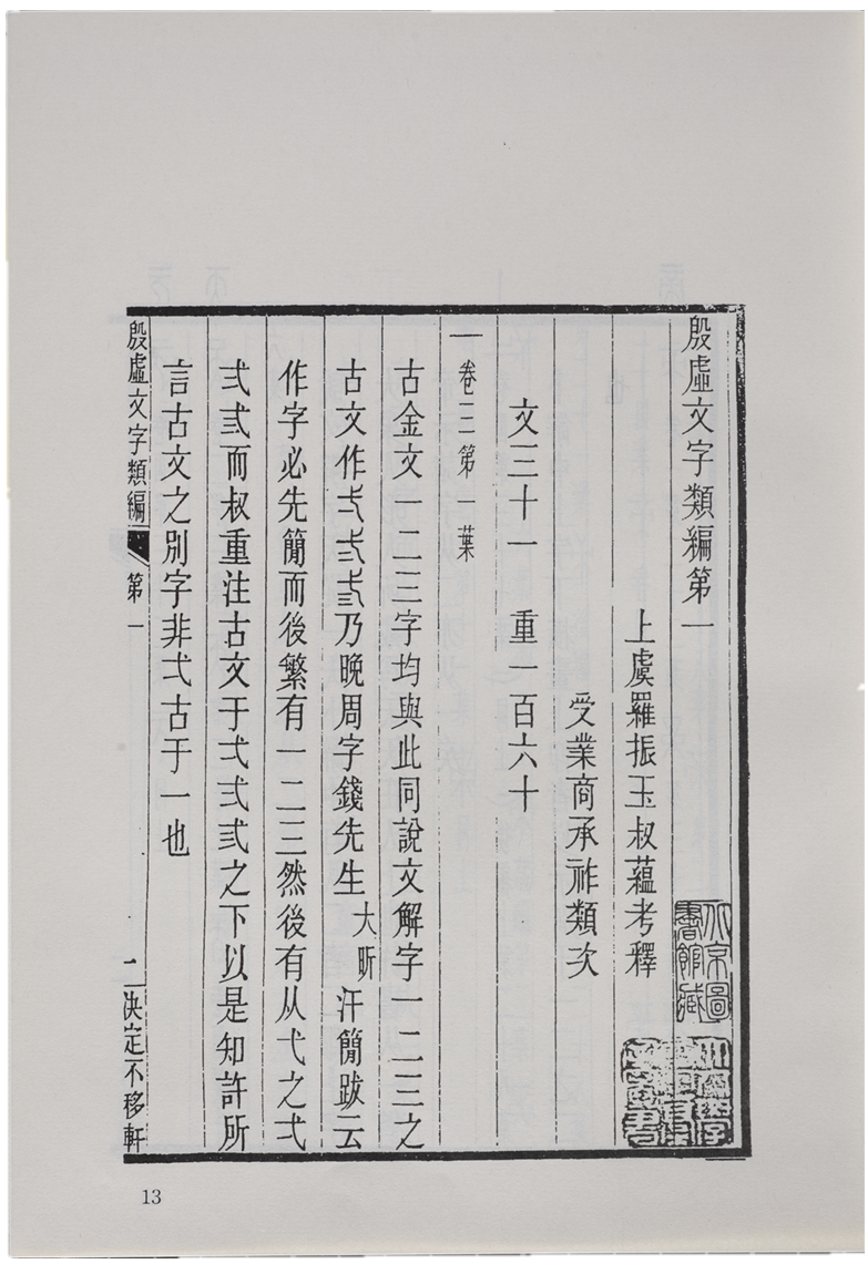 本书依《说文解字》体例编排,收甲骨文单字790字。凡罗振玉有解说者照录之,商承祚另有见解之字或新释者则以“祚案”别之。在严谨考释的基础上大胆创新,勇立新说。王国维亲自校对增补并作序,称赞“锡永此书可以传世矣”。