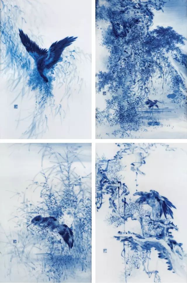 【青花灵禽春夏秋冬图四屏】