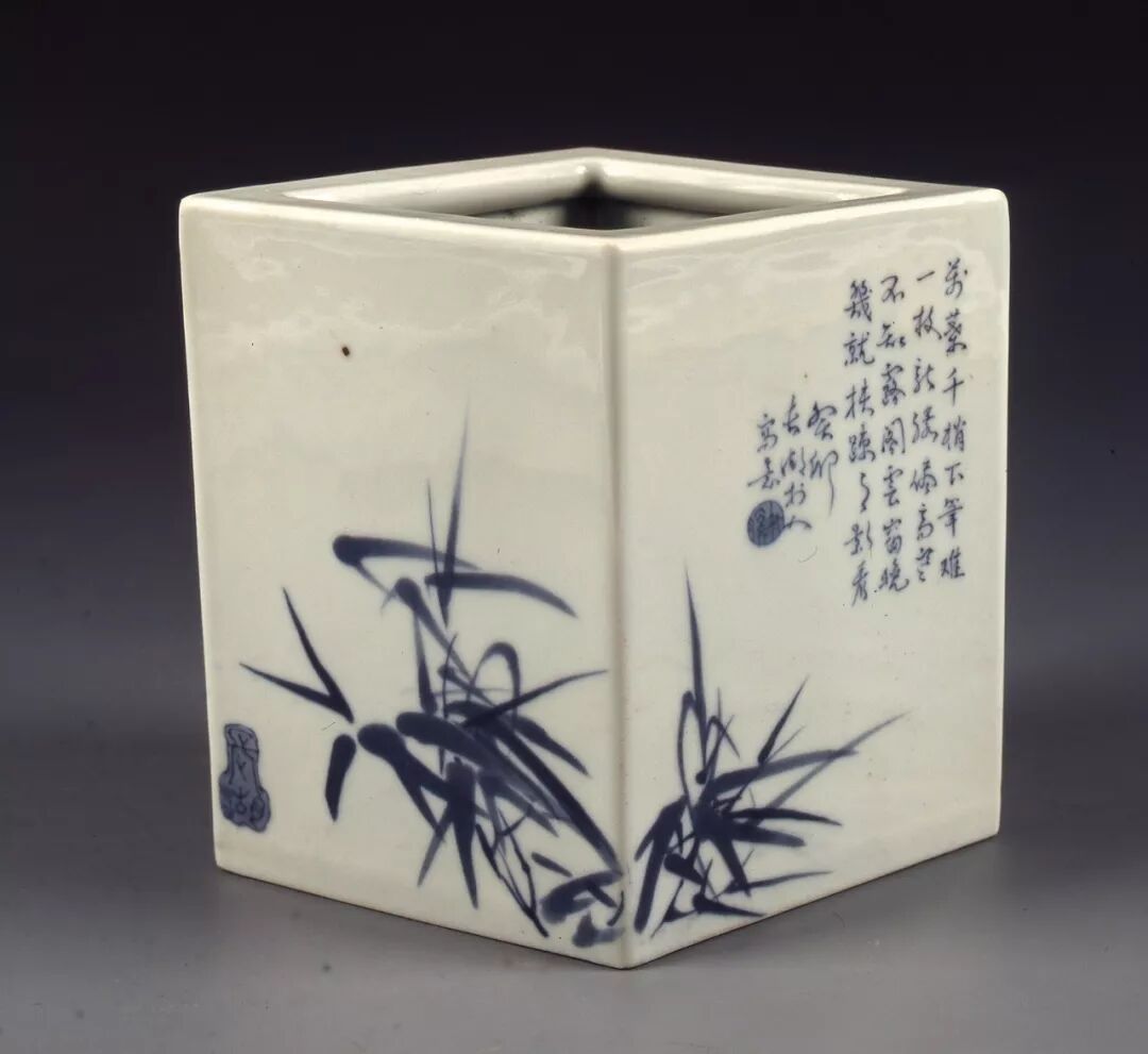青花竹菊图四方笔筒