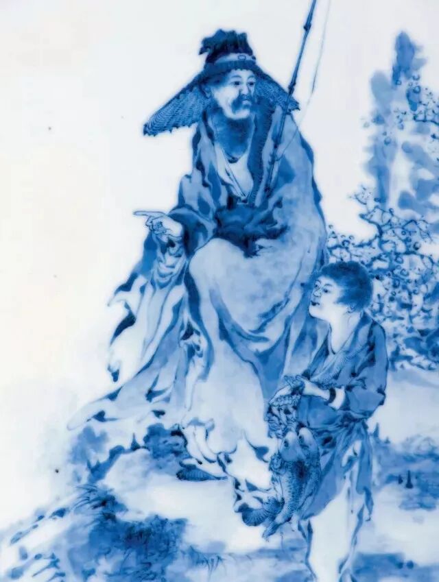 王步 青花 寒江垂钓人物图板
