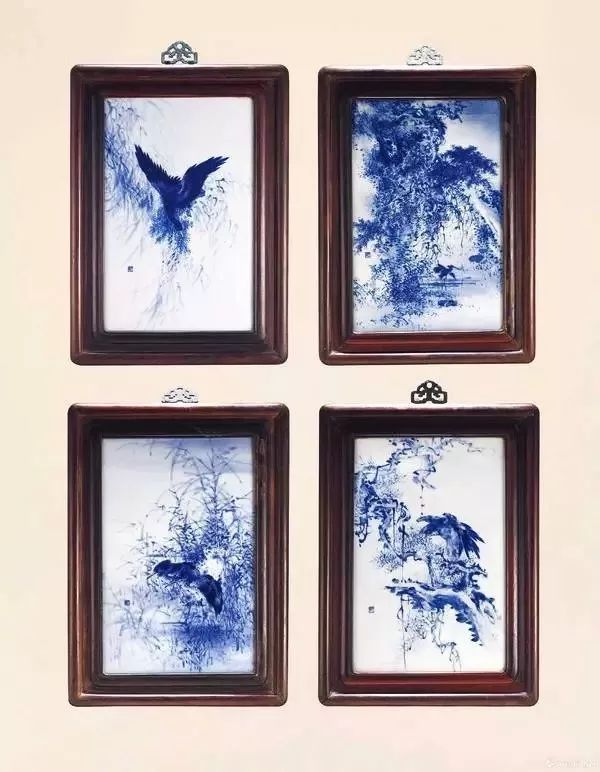 王步 青花 灵禽春夏秋冬四屏