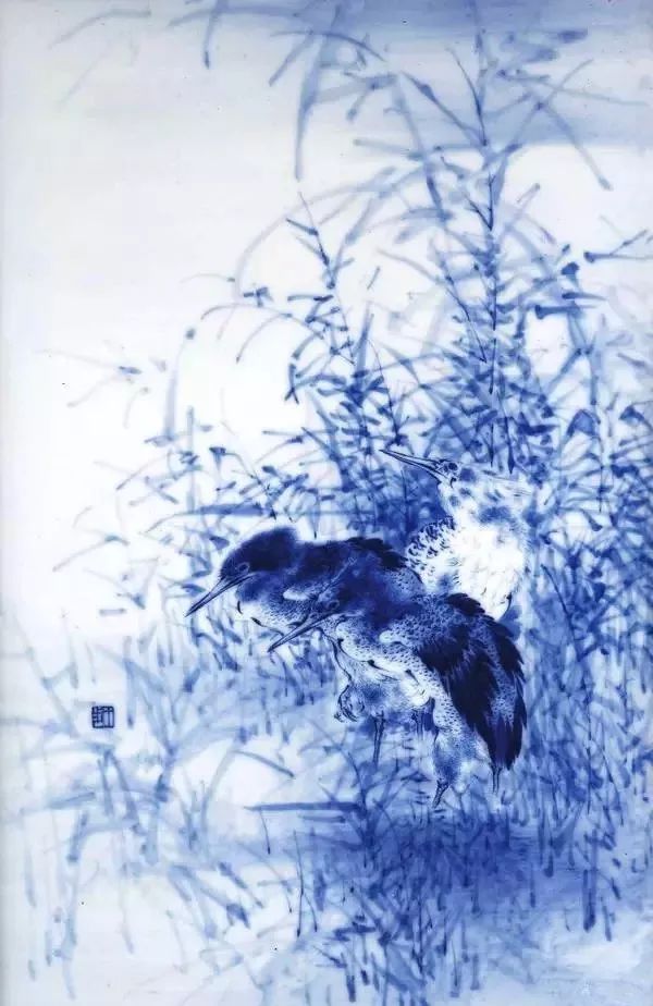 王步 青花 芦雁诗意图横板(局部)