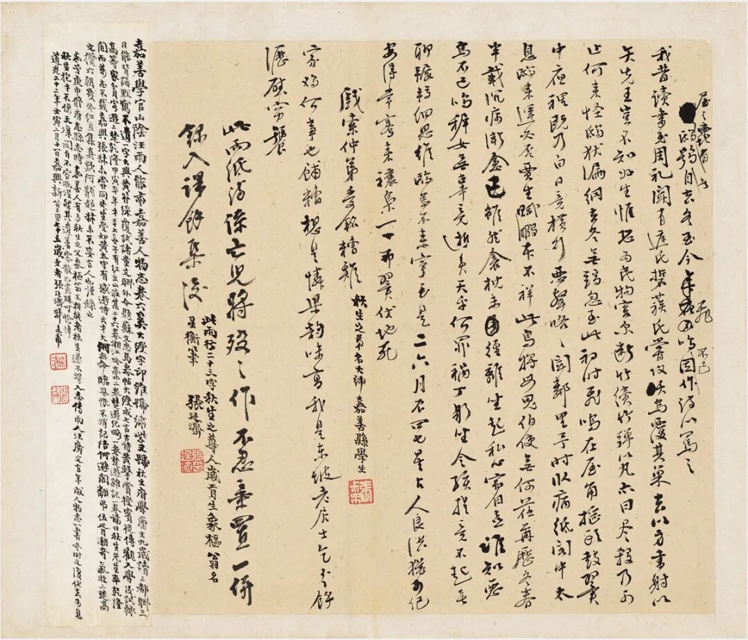 此为奚大绶绝笔,上有其父奚象枢跋二行,所书诗乃为其弟奚大绅所作,此件集奚氏父子三人于一稿,奚大绶与张廷济有同窗之谊,少时即才气过人,惜天不假年。上有张廷济小字长跋数百言。