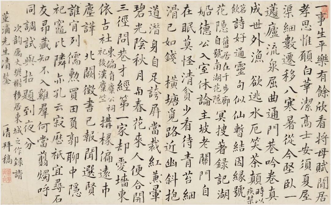 此为清代藏书家、地理学家赵一清所作七律四首,次韵厉鹗乾隆五年(1740)初夏从南湖移居东城所作《移居诗》四首。诗中不仅描述了移居经过及新居周边,还表达了对厉鹗归隐田园的赞誉之情。上款为清乾隆间大儒、诗人杭世骏,为赵一清好友,曾为赵一清《东潜文稿》作序。