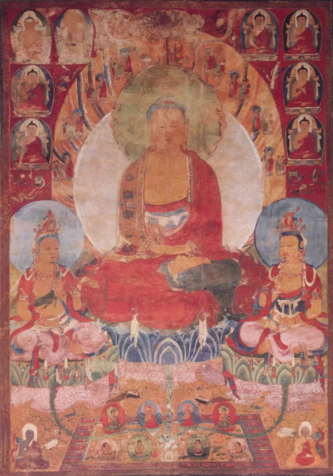 唐代莫高窟有许多巨幅净土变,描绘极乐世界的宏大场面,如华丽的宫殿、飞舞的伎乐和绚丽的随从等。而西夏的阿弥陀佛净土,构图简单,只出现阿弥陀佛和两位胁侍菩萨,着重表现来迎场面,其以整个画幅描绘阿弥陀佛和两位胁侍菩萨接引已故信徒往至净土途中的情景。这种情景已见于七世纪敦煌藏经洞所出绘画引路菩萨,但其表现地是一般的救渡概念,具体、完整的将阿弥陀、观音、势至及已故信徒的肖像画进图中的惯例则流行于此时。比之于净土的华美,能够前往才是更重要的,这是西夏在继承的基础上而发展的独特性。