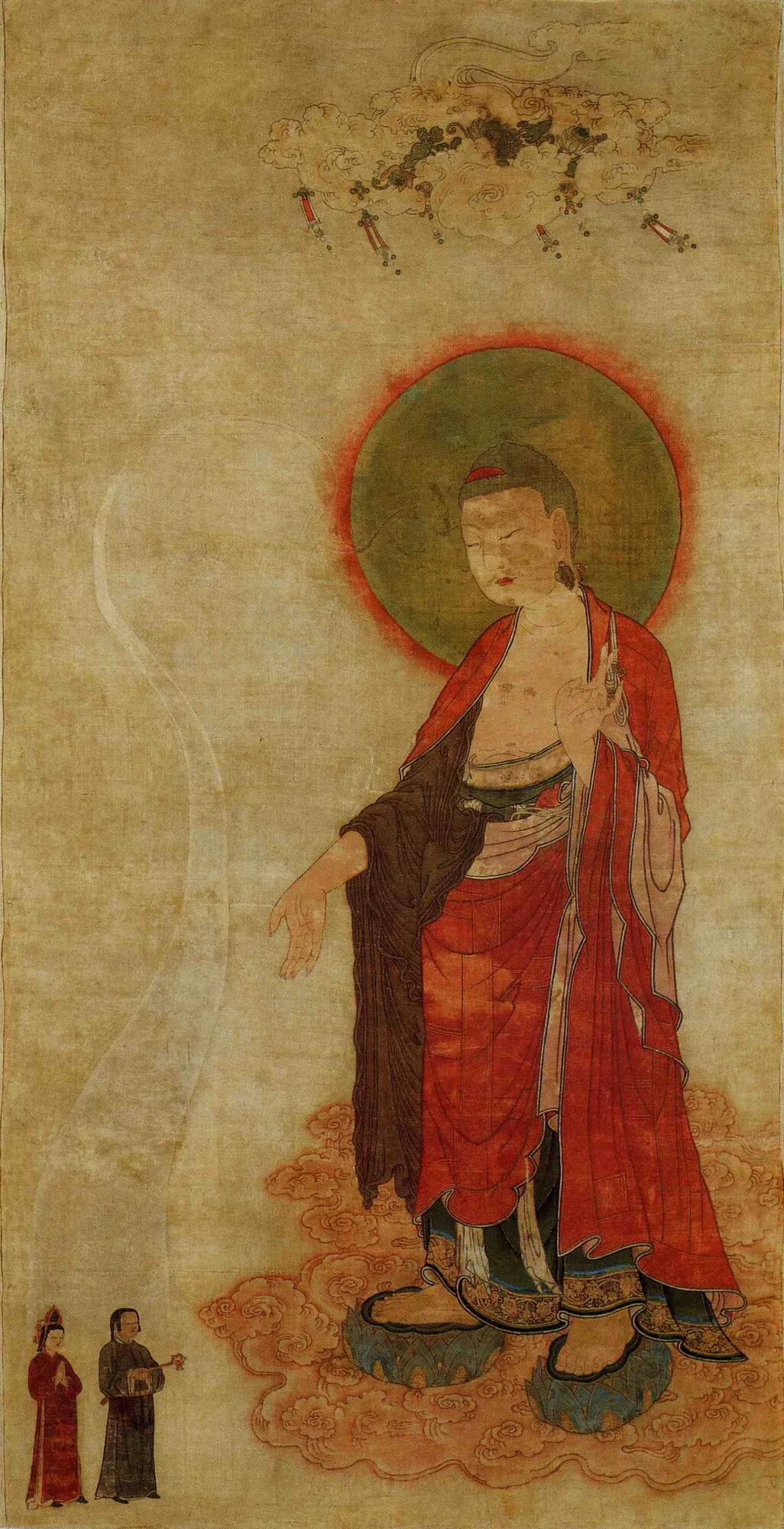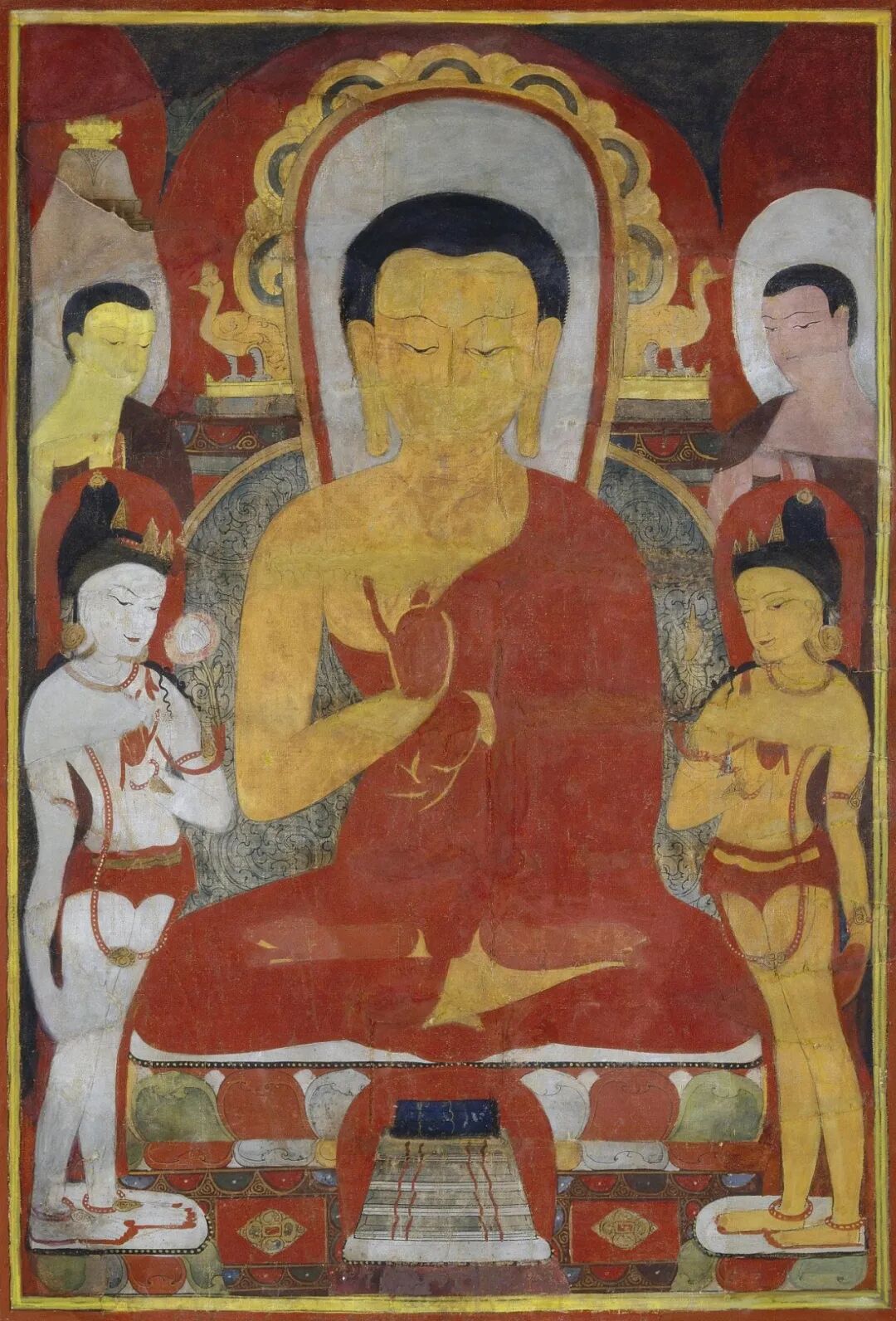 自七世纪起的三百年间,吐蕃及契丹、女真、回鹘、西夏等,纷纷兴建独立国家,创造自己的文化。契丹与女真基本模仿或采用中原文化,吐蕃则更多地揉进中亚、南亚因素,形成独具特色的吐蕃文化。西夏介于其间,不可避免地受到多种文化的影响。反映在佛教方面,西夏前期主要吸收汉地佛教,译经时又得到回鹘僧人的帮助和支持;西夏中后期,则吸收融合藏传佛教,使其在西夏迅速传播。西夏佛教遗存包罗宏富,有寺院、石窟寺、绘画和有关的经卷、文书等,其中卷轴画是富于代表性的一种艺术形式。卷轴画为装裱后、两端加轴可卷舒的画幅形式,质地以绢、布或纸为主。藏语所称唐卡,为一种特殊的卷轴画,其用彩缎装裱,构图紧凑,色彩绚丽,民族特色浓郁。目前发现的西夏卷轴画主要集中在内蒙古与宁夏两地。本世纪初俄国探险家科兹洛夫在内蒙古额济纳旗黑水城遗址的佛塔中,发现卷轴画200余幅,现保存于俄罗斯圣彼得堡艾尔米塔什博物馆;六十年代在宁夏青铜峡市108塔塔群下方河滩地上的2号小塔中发现卷轴画2幅;八、九十年代抢救维修宁夏境内的西夏佛塔时于贺兰县拜寺口西塔中发现卷轴画2幅、贺兰县宏佛塔中发现卷轴画14幅。上述卷轴画面积最大者160×108厘米,最小者26.5×17厘米,绝大部分为佛教内容,个别反映了道教,非宗教内容甚少。