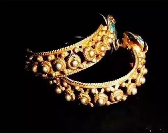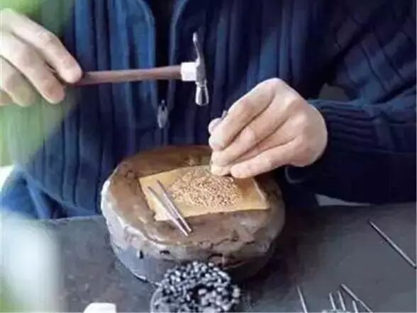 将黄金溶液滴入温水中会形成大小不等的金珠,谓之炸珠。炸珠形成的金珠通常焊接在金、银器物上以作装饰,如联珠纹、鱼子纹等。