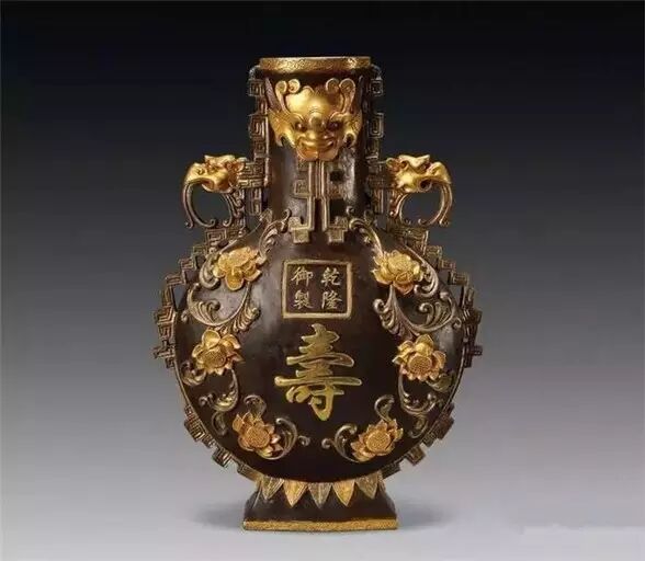 此壶为银质鎏金,刻有“大清乾隆年製”六字,盖下口近缘处铸卷浪纹。壶颈部饰一圈八宝花,腹部光素无纹,壶腹一侧有龙形把手,其上部有金链一条与盖相连,圈足饰垂莲瓣纹。该壶造型体现了乾隆盛世精湛的工艺和高雅的审美情趣。
