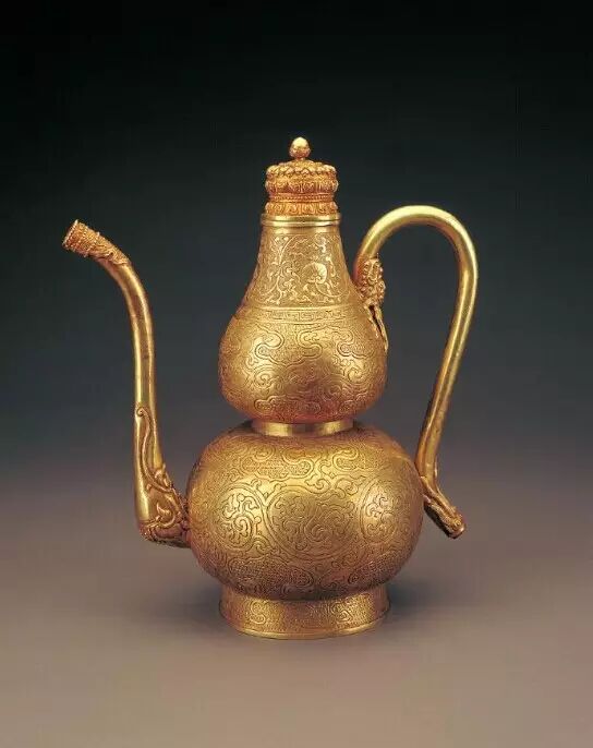 执壶为五成金质,直口,直颈,壶身呈葫芦形,象首流,龙首柄,高圈足,有双层莲瓣纹盖。通体錾刻缠枝莲花纹。