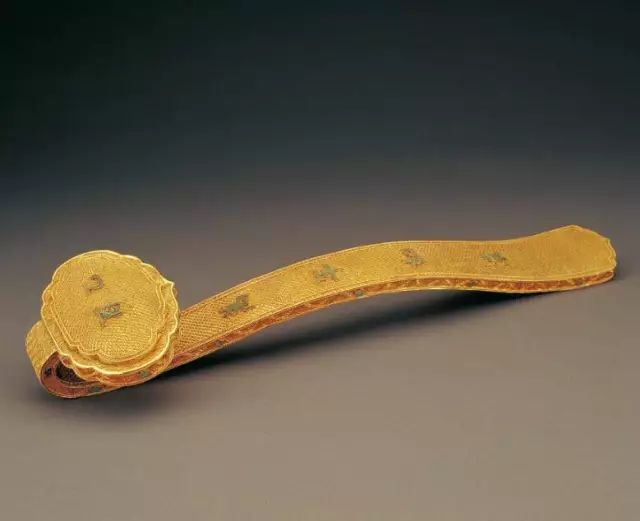 八成金累丝万年如意,清,长42.7cm,柄宽5.4cm,头最宽11.3cm.